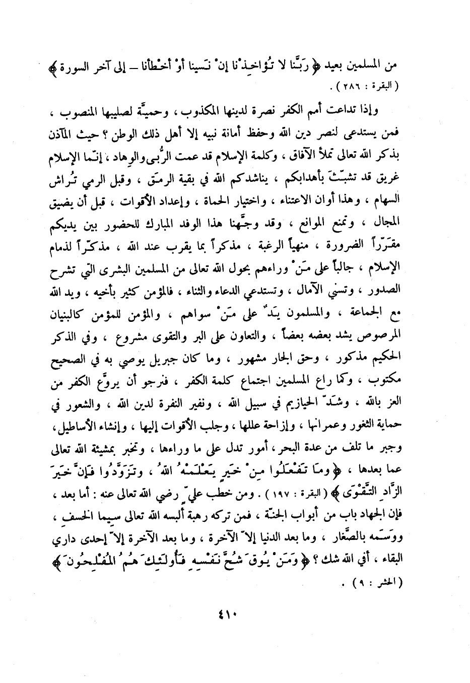 وإذا تداعت أمم الكفر نصرة لدينها المكذوب، وحمية لصليبها المنصوب، فمن يستدعى لنصر دين الله وحفظ أمانة نبيه إلا أهل ذلك الوطن حيث المآذن بذكر الله تعالى تملأ الآفاق، وكلمة الإسلام قد عمت الربى والوهاد، إنما الإسلام غريق قد تشبث بأهدابكم، يناشدكم الله في بقية الرمق، وقبل الرمي تراش السهام، وهذا أوان الاعتناء، واختيار الحماة، وإعداد الأقوات، قبل أن يضيق المجال، وتمنع الموانع، وقد وجهنا هذا الوفد المبارك للحضور بين يديكم مقرراً الضرورة، منهياً الرغبة، مذكراً بما يقرب عند الله، مذكراً لذمام الإسلام، جالباً على من ورائهم بحول الله تعالى من المسلمين البشرى التي تشرح الصدور، وتسني الآمال، وتستدعي الدعاء والثناء، فالمؤمن كثير بأخيه، ويد الله مع الجماعة، والمسلمون يد على من سواهم، والمؤمن للمؤمن كالبنيان المرصوص يشد بعضه بعضاً، والتعاون على البر والتقوى مشروع، وفي الذكر الحكيم مذكور، وحق الجار مشهور، وما كان جبريل يوصي به في الصحيح مكتوب وكما راع المسلمين اجتماع كلمة الكفر، فنرجو أن يروع الكفر من العز بالله، وشد الحيازيم في سبيل الله، ونفير النفرة لدين الله، والشعور في حماية الثغور وعمرانها، وإزاحة عللها، وجلب الأقوات إليها، وإنشاء الأساطيل، وجبر ما تلف من عدة البحر، أمور تدل على ما ورائها، وتخبر بمشيئة الله تعالى عما بعدها " وما تفعلوا من خير يعلمه الله، وتزودوا فإن خير الزاد التقوى " ومن خطب على رضي الله تعالى عنه: أما بعد، فإن الجهاد باب من أبواب الجنة، فمن تركه رهبة ألبسه الله تعالى سيما الخسف، ووسمه بالصغار، وما بعد الدنيا إلا الآخرة، وما بعد الآخرة إلا إحدى داري البقاء، أفي الله شك " ومن يوق شح نفسه فأولئك هم المفلحون ". (الحشر: 9) .
