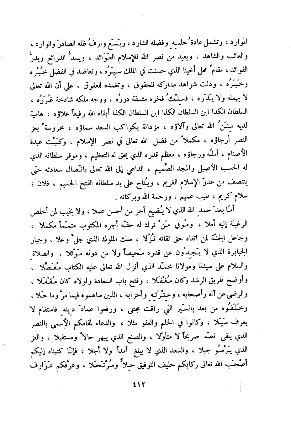 أما بعد حمد الله الذي لا يضيع أجر من أحسن عملا، ولا يخيب من أخلص الرغبة إليه أملا، وموفي من ترك له حقه أجره المكتوب متمماً مكملا، وجاعل الجنة لمن اتقاه حق تقاته نزلا، ملك الموت الذي جل وعلا، وجبار الجبابرة الذي لا يجدون على قدره محيصاً ولا من دونه موثلا، والصلاة والسلام على سيدنا ومولانا محمد الذي أنزل الله تعالى عليه الكتاب مفصلا، وأوضح طريق الرشد وكان مغفلا، وفتح باب السعادة ولولاه كان مقفلا، والرضى على آله وأصحابه، وعترته وأحزابه، الذي ساهموه فيما مر وما حلا، وخلفوه من بعد بالسير التي راقت مجتلى، ورفعوا عماد دينه فاستقام لا يعرف ميلا، وكانوا في الحلم والعفو مثلا، والدعاء لمقامكم الأسمى بالنصر الذي يلقى نصه صريحاً لا متأولا، والصنع الذي يبهر حاللاً ومستقبلا، والعز الذي يرسو جبلا، والسعد الذي لا يبلغ أمداً ولا أجلا، فإنا كتبناه إليكم أصحب الله تعالى ركابكم حليف التوفيق حلاً ومرتحلا، وعرفكم عوارف