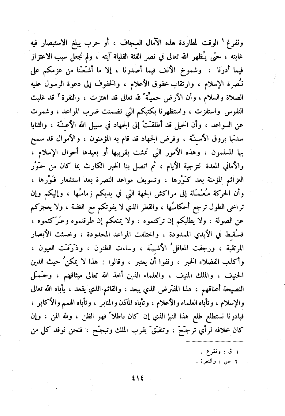 ونفرغ (1) الوقت لمطاردة هذه الآمال العجاف، أو حرب يبلغ الاستبصار فيه غايته، حتى يظهر الله تعالى في نصر الفئة القليلة آيته، ولم نجعل سبب الاعتزاز فيما أدرنا، وشموخ الأنف فيما أصدرنا، إلا ما أشعنا من عزمكم على نصرة الإسلام، وارتقاب خفوق الأعلام، والخفوف إلى دعوة الرسول عليه الصلاة والسلام، وأن الأرض حمية لله تعالى قد اهتزت، والنفرة (2) قد غلبت للنفوس واستفزت، واستظهرنا بكتبكم التي تضمنت ضرب المواعد، وشمرت عن السواعد، وأن الخيل قد أطلقت إلى الجهاد في سبيل الله الأعنة، والثنايا سدتها بروق الأسنة، وفرض الجهاد قد قام به المسلمون، والأموال قد سمح بها المؤمنون، وهذه الأمور التي تمشت بقريبها أو بعيدها أحوال الإسلام، والأماني المعدة لتزجية الأيام، ثم اتصل بنا الخبر الكارث، بما كان من حور العزائم المؤمنة بعد كورها، وتسويف مواعد النصرة، بعد استشعار فورها، وأن الحركة معملة إلى مراكش الجهة التي في يديكم زمامها، وإليكم وإن تراخى الطول ترجع أحكامها، والقطر الذي لا يفوتكم مع الغفلة، ولا يعجزكم عن الصولة، ولا يطلبكم إن تركتموه، ولا يمنعكم إن طرقتموه أو عركتموه، فسقط في الأيدي الممدودة، واختلفت المواعد المحدودة، وخسئت الأبصار المرتقبة، ورجفت المعاقل الأشبة، وساءت الظنون، وذرفت العيون، وأكذب الفضلاء الخبر، ونفوا أن يعتبر، وقالوا: هذا لا يمكن حيث الدين الحنيف، والملك المنيف، والعلماء الذين أخذ الله تعالى ميثاقهم، وحمل النصيحة أعناقهم، هذا المفترض الذي يبعد، والقائم الذي يقعد، يأباه الله تعالى والإسلام، وتأباه العلماء والأعلام، وتأباه المآذن والمنابر، وتأباه الهمم والأكابر، فبادرنا نستطلع طلع هذا النبأ الذي إن كان باطلاً فهو الظن، ولله المن، وإن كان خلافه لرأي ترجح، وتنفق بقرب الملك وتبجح، فنحن نوفد كل من