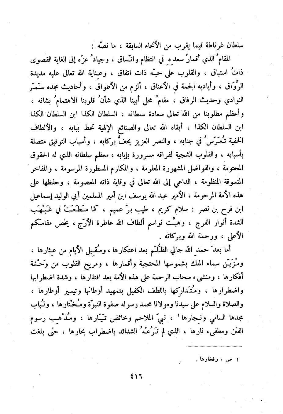 المقام الذي أقمار سعده في انتظام واتساق، وجياد عزه إلى الغاية القصوى ذات استباق، والقلوب على حبه ذات اتفاق، وعناية الله تعالى عليه مديدة الرواق، وأياديه الجمة في الأعناق، ألزم من الأطواق، وأحاديث مجده سمر النوادي وحديث الرفاق، مقام محل أبينا الذي شان قلوبنا الاهتمام بشأنه، وأعظم مطلوبنا من الله تعالى ساعدة سلطانه، السلطان الكذا ابن السلطان الكذا ابن السلطان الكذا، أبقاه الله تعالى والصنائع الإلهية تحيط ببابه، والألطاف الخفية تعرس في جنابه، والنصر العزيز يحف بركابه، وأسباب التوفيق متصلة بأسبابه، والقلوب الشجية لفراقه، مسرورة بإيابه، معظم سلطانه الذي له الحقوق المحتومة، والفواصل المشهورة المعلومة، والمكارم المسطورة المرسومة، والمفاخر المنسوقة المنظومة، الداعي إلى الله تعالى في وقاية ذاته المعصومة، وحفظها على هذه الأمة المرحومة، الأمير عبد الله يوسف ابن أمير المسلمين أبي الوليد إسماعيل ابن فرج بن نصر، سلام كريم، طيب بر عميم، كما سطعن في غيهب الشدة أنوار الفرج، وهبت نواسم ألطاف الله عاطرة الأرج، يخص مقامكم الأعلى، ورحمة الله تعالى وبركاته.