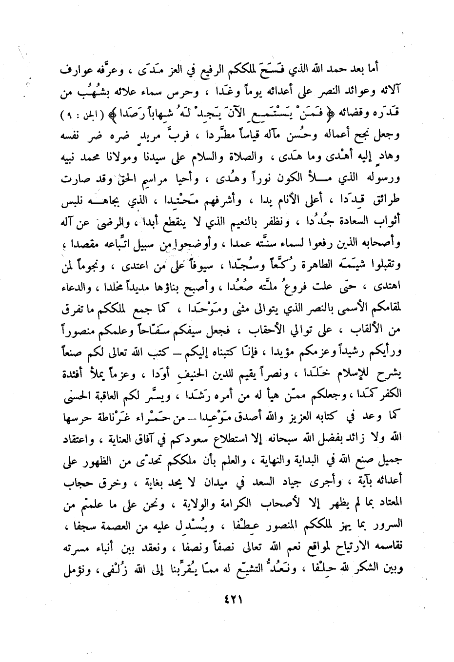 أما بعد حمد الله الذي فسح لملككم الرفيع في العز مدى، وعرف عوارفه آلائه وعوائد النصر على أعدائه يوماً وغدا، وحرس سماء علائه بشهب من قدره وقضائه " فمن يستمع الآن يجد له شهباًُ رصدا " وجعل نجح أعماله وحسن مآله قياسا مطردا، فرب مريد ضره ضر نفسه وهاد إليه أهدى وما هدى، والصلاة والسلام على سيدنا ومولانا محمد نبيه ورسوله الذي ملأ الكون نوراً وهدى، وأحيا مراسم الحق وقد صارت طرائق قددا، أعلى الأنام يدا، وأرفهم محتدا، الذي بجاهه نلبس أثواب السعادة جددا، ونظفر بالنعيم الذي لا ينقط أبدا، والرضى عن آله وأصحابه الذين رفعوا لسماء سنته عمدا، وأوضحوا من سبيل اتباعه مقصدا، وتقبلوا شيمه الطاهرة ركعاً وسجدا، سيوفاً على من اعتدى ونجوماً لمن اهتدى، وعلت فروع ملته صعدا، وأصبح بناؤها مديداً مخلدان والدعاء لمقامكم الأسمى بالنصر الذي يتوالى مثنى وموحدا، كما جمع لملككم ما تفرق من الألقاب على توالي الأحقاب، فجعل سيفكم سفاحاً وعلمكم منصوراً ورأيكم رشيداً وعزمكم مؤيدان فإنا كتبناه إليكم - كتب الله تعالى لكم صنعاً يشرح للإسلام خلدا، ونصراً يقيم للدين الحنيف أودا، وعزماً يملأ أفئدة الكفر كمدا، وجعلكم ممن هيأ له من أمره رشدا، ويسر لكم العاقبة الحسنى كما وعد في كتابه العزيز والله أصدق موعدا - من حمراء غرناطة حرسها الله ولا زائد بفضل الله سبحانه إلا استطلاع سعودكم في آفاق العناية، واعتقاد جميل صنع الله في البداية والنهاية، والعلم بأن ملككم تحدى من الظهور على أعدائه بآية وأجرى جياد السعد في ميدان لا يحد بغاية، وخرق حجاب المعتاد بما لم يظهر إلا لأصحاب الكرامة والولاية، ونحن على ما علمتم من السرور بما يهز لملككم المنصور عطفا، ويسدل عليه من العصمة سجفان نقاسمه الارتياح لمواقع نعم الله تعالى نصفاً ونصفا، ونعقد بين أنباء مسرته وبين الشكر لله حلفا، ونعد التشييع له مما يقربنا إلى الله زلفى، ونؤمل