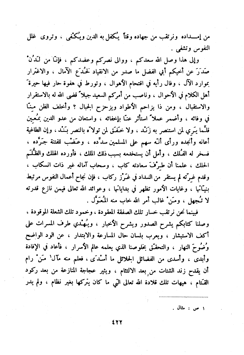فبينما نحن نرتقب خسار تلك الصفقة المعقودة، وخمود تلك الشعلة الموقودة، وصلنا كتابكم يشرح الصدور ويشرح الأخبار، ويهدي طرف المسرات على أكف الاستبشار، ويعرب بلسان حال المسارعة والابتدار، عن الود الواضح وضوح النهار، والتحقق بخلوصنا الذي يعلمه عالم الأسرار، فأعاد في الإفادة وأبدى، وأسدى من الفضائل الجلائل ما أسدى فعلم منه مآل (1) من رام أن يقدح زند الشتات من بعد الالتئام، ويثير عجاجة المنازعة من بعد ركود القتام، هيهات تلك قلادة الله تعالى التي ما كان يتركها بغير نظام، ولم يدر