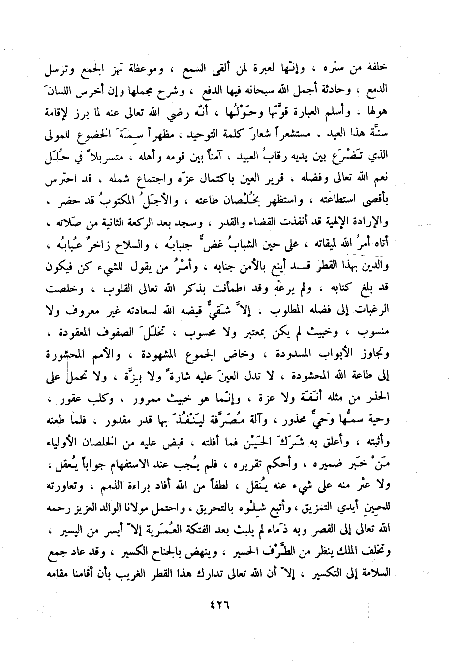 خلفه من ستره، وإنها لعبرة لمن ألقى السمع، وموعظة تهز الجمع وترسل الدمع، وحادثة أجمل الله سبحانه فيها الدفع، وشرح مجملها وإن أخرس اللسان هولها، وأسلم العبارة قوتها وحولها، أنه رضي الله تعالى عنه لما برز لإقامة سنة هذا العيد، مستشعراً شعار كلمة التوحيد، مظهراً سمة الخضوع للمولى الذي تضرع بين يديه رقاب العبيد، آمناً بين قومه وأهله، متسربلاً في حلل نعم الله تعالى وفضله، قرير العين باكتمال عزه واجتماع شمله، قد احترس بأقصى استطاعته، واستظهر بخلصان طاعته، والأجل المكتوب قد حضر، والإرادة الإلهية قد أنفذت القضاء والقدر، وسجد بعد الركعة الثانية من صلاته، أتاه أمر الله لميقاته، على حين الشباب غض جلبابه، والسلاح زاخر عبابه، والدين بهذا القطر قد أينع بالأمن جنابه، وأمر من يقول للشيء كن فيكون قد بلغ كتابه، ولم يرعه وقد اطمأنت بذكر الله تعالى القلوب، وخلصت الرغبات إلى فضله المطلوب، إلا شقي قيضه الله لسعادته غير معروف ولا منسوب، وخبيث لم يكن بمعتبر ولا محسوب، تخلل الصفوف المعقودة، إلى طاعة الله المحشودة، لا تدل العين عليه شارة ولا بزة، ولا تحمل على الحذر من مثله أنفة ولا عزة، وإنما هو خبيث ممرور، وكلب عقور، وحية سمها وحي محذور، وآلة مصرفة لينفذ بها قدر مقدور، فلما طعنه وأثبته، وأعلق به شرك الحين فما أفلتهن قبض عليه من الخلصان الأولياء، من خبر ضميره، وأحكم تقريره، فلم يجب عند الاستفهام جواباً يعقل، ولا عثر منه على شيء عنه ينقل، لطفاً من الله أفاد براءة الذمم، وتعاوته للحين أيدي التمزيق، وأتبع شلوه بالتحريق، واحتمل مولانا الوالد العزيز رحمه الله تعالى إلى القصر وبه دماء لم يلبث بعد الفتكة العمرية إلا أيسر من اليسير، وتخلف الملك ينظر من الطرف الحسير، وينهض بالجناح الكسير، وقد عاد جمع السلامة إلى التكسير، إلا أن الله تعالى تدارك هذا القطر الغريب بان أقامنا مقامه