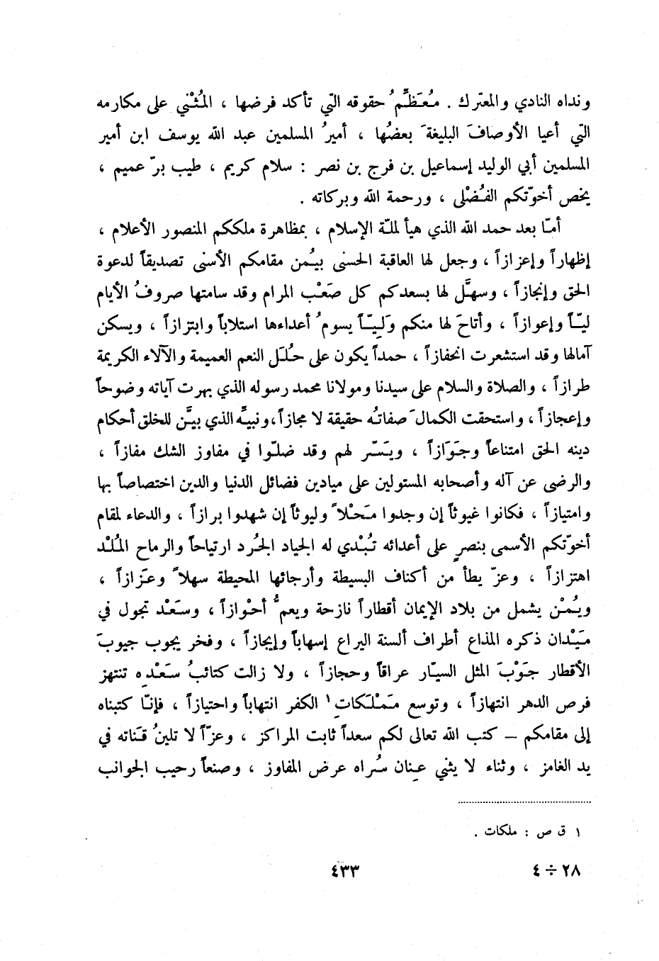 أما بعد حمد الله الذي هيأ لملة الإسلام، بمظاهرة ملككم المنصور الأعلام، إظهاراً وإعزازاً، وجعل لها العاقبة الحسنى بيمن مقامكم الأسنى تصديقاً لدعوة الحق وإنجازاً، وسهل لها بسعدكم كل صعب المرام وقد سامتها صروف الأيام لياً وإعوازاً، وأتاح لها منكم ولياً يسوم أعداءها استلاباً وابتزازاً، ويسكن آمالها وقد استشعرت انحفازاً، حمداً يكون على حلل النعم العميمة والآلاء الكريمة طرازاً، والصلاة والسلام على سيدنا ومولانا محمد رسوله الذي بهرت آياته وضوحاً وإعجازاً، واستحقت الكمال صفاته حقيقة لا مجازاً، ونبيه الذي بين للخلق أحكام دينه الحق امتناعاً وجوازاً، ويسر لهم وقد ضلوا في مفاوز الشك مفازاً، والرضى عن آله وأصحابه المستولين على ميادين فضائل الدنيا والدين اختصاصاً بها وامتيازاً، فكانوا غيوثاً إن وجدوا محلاً وليوثاً إن شهدوا برازاً، والدعاء لمقام أخوتكم الأسمى بنصرٍ على أعدائه تبدي له الجياد الجرد ارتياحاً والرماح الملد اهتزازاً، وعز يطأ من أكناف البسيطة وأرجائها المحيطة سهلاً وعزازاً، ويمن يشمل من بلاد الإيمان أقطاراً نازحة ويعم أحوازاً، وسعد تجول في ميدان ذكره المذاع أطراف ألسنة اليراع إسهاباً وإيجازا، وفخر يجوب جيوب الأقطار جوب المثل السيار عراقاً وحجازاً، ولا زالت كتائب سعده تنتهز فرص الدهر انتهازا، وتوسع مملكات (1) الكفر انتهاباً واحتيازاً، فإنا كتبناه إلى مقامكم - كتب الله تعالى لكم سعداً ثابت المراكز، وعزاً لا تلين قناته في يد الغامز، وثناء لا يثني عنان سراه عرض المفاوز، وصنعاً رحيب الجوانب