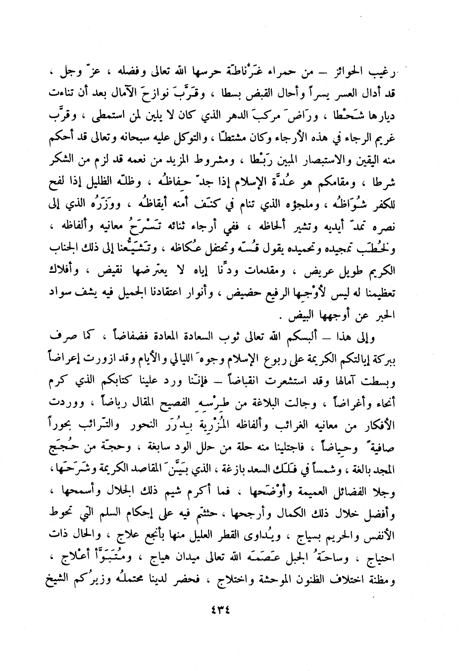 وإلى هذا - ألبسكم الله تعالى ثوب السعادة المعادة فضفاضاً، كما صرف ببركته إيالتكم الكريمةعلى ربوع الإسلام وجوه الليالي والأيام وقد ازوروت إعراضاً وبسطت آمالها وقد استشعرت انقباضاً - فإننا ورد علينا كتابكم الذي كرم أنحاء وأغراضاً، وجالت البلاغة من طرسه الفصيح المقال رياضاً، ووردت الأفكار من معانيه الغرائب وألفاظه المزرية بدرر النحور والترائب بحوراً صافيةً وحياضاً، فاجتلينا منه حلة من حلل الورد سابغة، وحجة من حجج المجد بالغة، وشمساً في فلك السعد بازغة، الذي بين المقاصد الكريمة وشرحها، وجلا الفضائل العميمة وأوضحها، فما أكرم شيم ذلك الجلال وأسمحها، وأفضل خلال ذلك الكمال وأرجحها، حثثتم فيه على إحكام السلم التي تحوط الأنفس والحريم بسياج، ويداوى القطر العليل منها بأنجع علاج، والحال ذات احتياج، وساحة الجبل عصمه الله تعالى ميدان هياج، ومتبوأ أعلاج، ومظنة اختلاف الظنون الموحشة واختلاج، فحضر لدينا محتمله وزيركم الشيخ