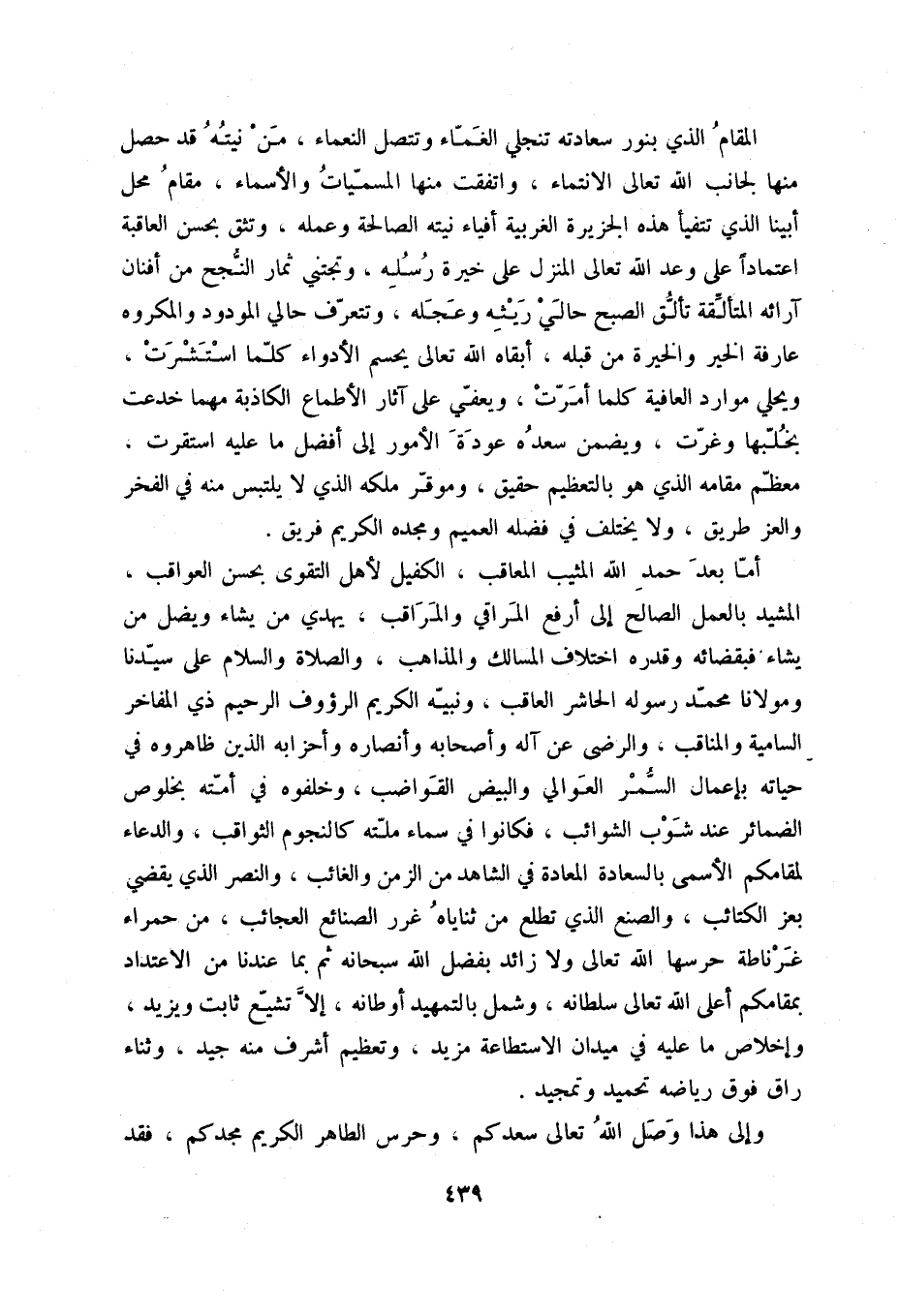 المقام الذي بنور سعادته تنجلي الغماء وتتصل النعماء، من نيته قد حصل منها لجانب الله تعالى الانتماء، واتفقت منه المسميات والأسماء، مقام محل أبينا الذي تتفيأ هذه الجزيرة الغربية أفياء نيته الصالحة وعمله، وتثق بحسن العاقبة اعتماداً على وعد الله تعالى المنزل على خيرة رسله، وتجتني ثمار النجح من أفنان آرائه المتألقة تألق الصبح حالي ريثه وعجله، وتتعرف حالي المورود والمكروه عارفة الخير والخيرة من قبله، أبقاه الله تعالى يحسم الأدواء كلما استشرت، ويحلي موارد العافية كلما أمرت، ويعفي على آثار الأطماع الكاذبة مهما خدعت بخلبها وغرت، ويضمن سعده عودة الأمور إلى أفضل ما عليه استقرت، معظم مقامه الذي هو بالتعظيم حقيق، وموقر ملكه الذي لا يلتبس منه في الفخر والعز طريق، ولا يختلف في فضله العميم ومجده الكريم فريق.