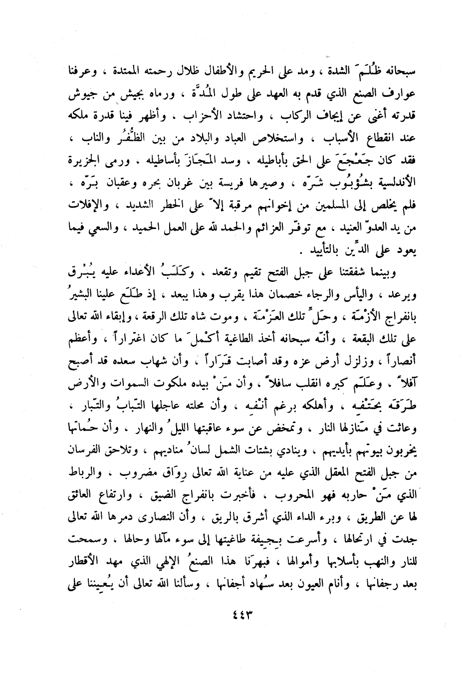 سبحانه ظلم الشدة، ومد على الحريم والأطفال ظلال رحمته الممتدة، وعرفنا عوارف الصنع الذي قدم به العهد على طول المدة، ورماه بجيش من جيوش قدرته أغنى عن إيجاف الركاب، واحتشاد الأحزاب، وأظهر فينا قدرة ملكه عند انقطاع الأسباب، واستخلاص العباد والبلاد من بين الظفر والناب، فقد كان جعجع على الحق بأباطيله، وسد المجاز بأساطيله، ورمى الجزيرة الأندلسية بشؤبوب شره، وصيرها فريسة بين غربان بحره وعقبان بره، فلم يخلص إلى المسلمين من إخوانهم مرقبة إلا على الخطر الشديد، والإفلات من يد العدو العنيد، مع توفر العزائم والحمد لله على العمل الحميد، والسعي فيما يعود على الدين بالتأييد.