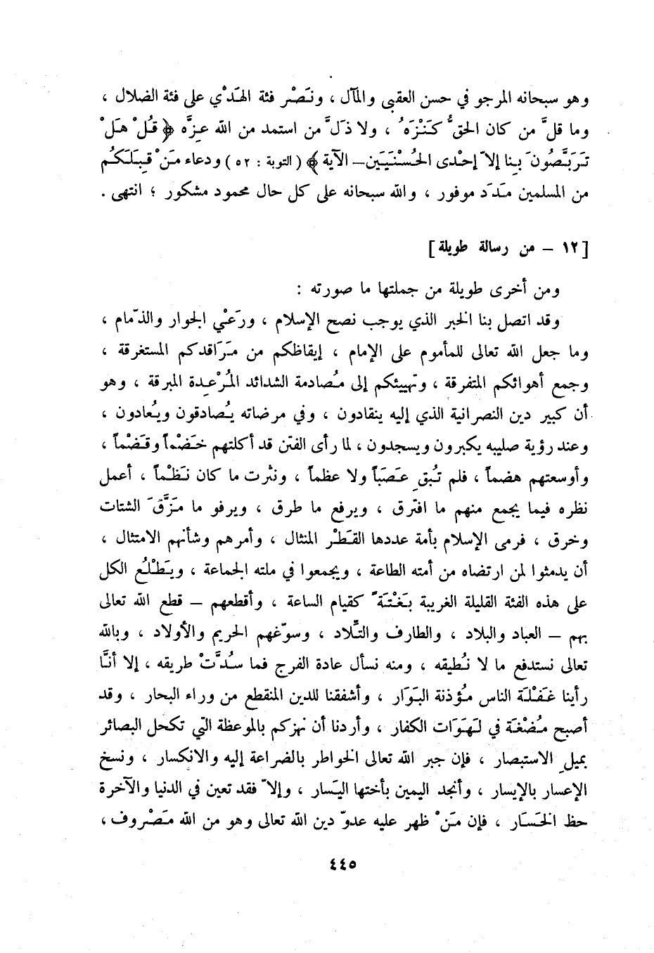 " وهو سبحانه المرجو في حسن العقبى والمآل، ونصر فئة الهدي على فئة الضلال، وما قل من كان الحق كنزه، ولا ذل من استمد من الله عزه " قل هل تربصون بنا إلا إحدى الحسنيين " ودعاء من قبلكم من المسلمين مدد موفور، والله سبحانه على كل حال محمود مشكور؛ انتهى.