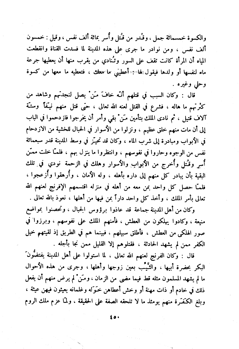 قال: وكان السبب في قتلهم أنه خاف من يصل لنجدتهم وشاهد من كثرتهم ما هاله، فشرع في القتل لعنة الله عليه تعالى، حتى قتل منهم نيفاً وستة آلاف قتيل، ثم نادى الملك بتأمين من بقي وأمر أن يخرجوا فازدحموا في الباب إلى أن مات منهم خلق عظيم، ونزلوا من الأسوار في الحبال للخشية من الازدحام في الأبواب ومبادرة إلى شرب الماء، وكان قد تحيز في وسط المدينة قدر سبعمائة نفس من الوجوه وحاروا في نفوسهم، وانتظروا ما ينزل بهم، فلما خلت ممن أسر وقتل وأخرج من الأبواب والأسوار وهلك في الزحمة نودي في تلك البقية بأن يبادر كل منهم إلى داره بأهله، وله الأمان، وأرهقوا وأزعجوا، فلما حصل كل واحد بمن معه من أهله في منزلهم اقتسم الإفرنج لعنهم الله تعالى بأمر الملك، وأخذ كل واحد داراً بمن فيها من أهلها، نعوذ بالله تعالى.