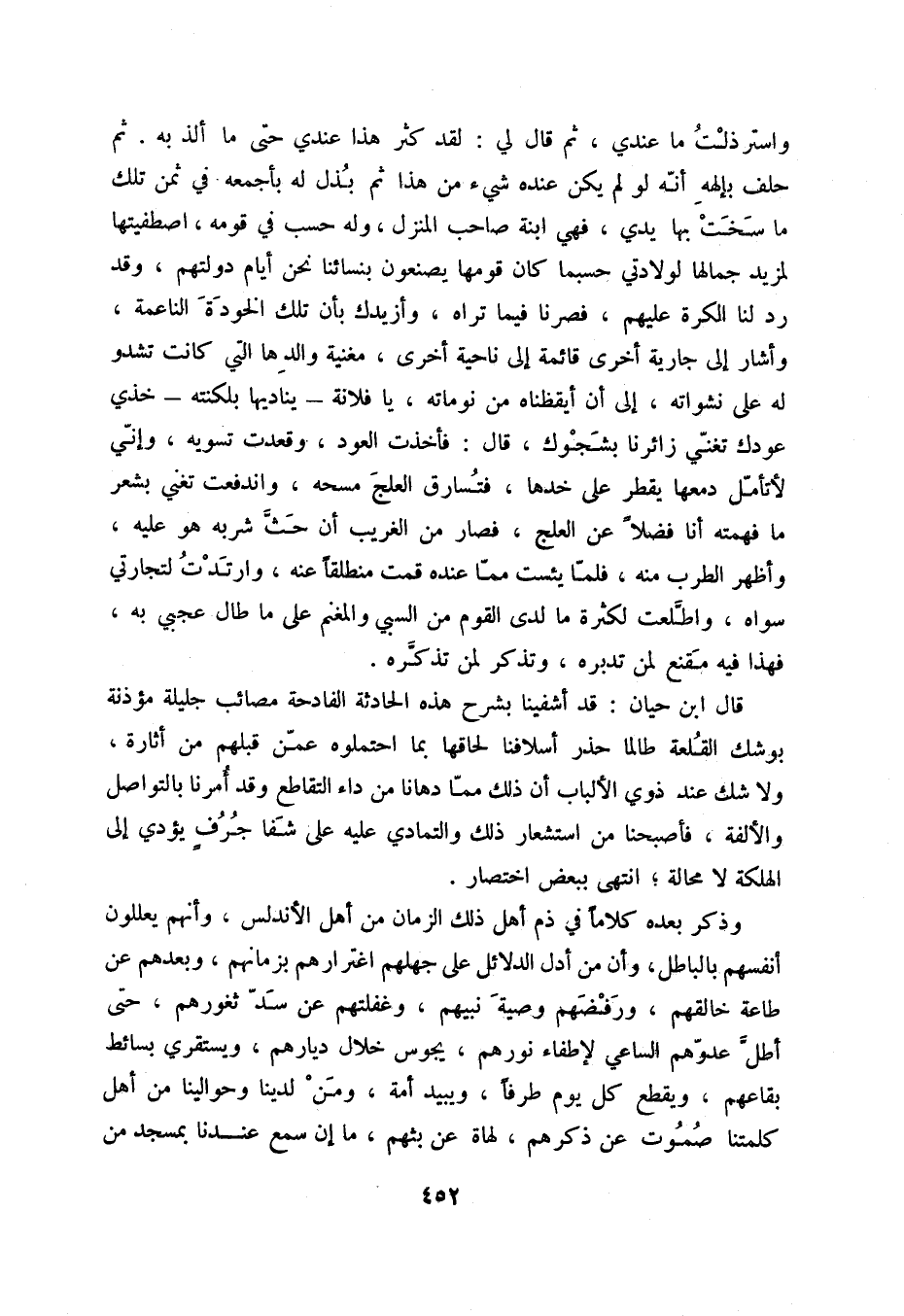 واسترذلت ما عندي، ثم قال لي: لقد كثر هذا عندي حتى ما ألذ به، ثم حلف بإلهه أنه لو لم يكن عنده شيء من هذا ثم بذل له بأجمعه في ثمن تلك ما سخت بها يدي، فهي ابنة صاحب المنزل، وله حسب في قومه، اصطفيتها لمزيد جمالها لولادتي حسبما كان قومها يصنعون بنسائنا نحن أيام دولتهم، وقد رد لنا الكرة عليهم، فصرنا فيما تراه، وأزيدك بأن تلك الخودة الناعمة، وأشار إلى جارية أخرى قائمة إلى ناحية أخرى، مغنية والدها التي كانت تشدو له على نشواته، إلى أن أيقظناه من نوماته، يا فلانة - يناديها بلكنته - خذي عودك تغني زائرنا بشجوك، قال: فأخذت العود، وقعدت تسويه، وإني لأتأمل دمعها يقطر على خدها، فتسار قالعلج مسحه، واندفعت تغني بشعر ما فهمته أنا فضلاً عن العلج، فصار من الغريب أن حث شربه هو عليه، وأظهر الطرب منه، فلما يئست ما عنده قمت منطلقاً عنه، وارتدت لتجارتي سواه، واطلعت لكثرة ما لدى القوم من السبي والمغنم على ما طال عجبي به، فهذا فيه مقنع لمن تدبره، وتذكر لمن تذكره.
