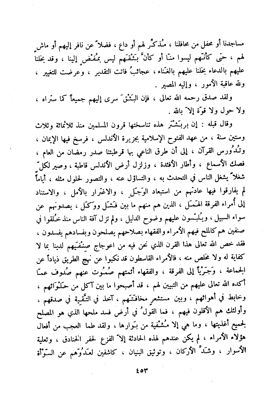 مساجدنا أو محفل من محافلنا، مذكر لهم أو داع، فضلاً عن نفر إليهم أو ماش لهم، حتى كأنهم ليسوا منا أو كان بثقهم ليس بمفض إلينا، وقد بخلنا عليهم بالدعاء بخلنا عليهم بالغناء، عجائب فاتت التقدير، وعرضت للتغيير، ولله عاقبة الأمور، وإليه المصير.