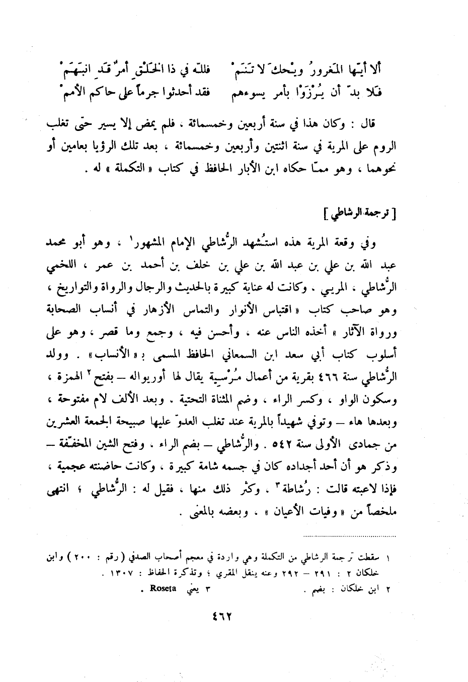 وفي وقعة المرية هذه استشهد الرشاطي الإمام المشهور (1) ، وهو أبو محمد عبد الله بن علي بن عبد الله بن علي بن خلف بن أحمد بن عمر، اللخمي الرشاطي، المريي، وكانت له عناية كبيرة بالحديث والرجال والرواة والتواريخ، وهو صاحب كتاب اقتباس الأنوار والتماس الأزهار في أنساب الصحابة ورواة الآثار أخذه الناس عنه، وأحسن فيه، وجمع وما قصر، وهو على أسلوب كتاب أبي سعد ابن السمعاني الحافظ المسمى الأنساب، وولد الرشاطي سنة 466 بقرية من أعمال مرسية يقال لها أوريواله - بفتح (2) الهمزة، وسكون الواو، وكسر الراء، وضم المثناة التحتية، وبعد الألف لام مفتوحة، وبعدها هاء - وتوفي شهيداً بالمرية عند تغلب العدو عليها صبيحة الجمعة العشرين من جمادى الأولىسنة 542. والرشاطي - بضم الراء، وفتح الشين الخففة - وذكر هو أن أحد أجداده كان في جسمه شامة كبيرة، وكانت حاضنته عجمية، فإذا لاعبته قالت: رشاطة (3) ، وكثر ذلك منها، فقيل له: الرشاطي؛ انتهى ملخصاً من وفيات الأعيان وبعضه بالمعنى.