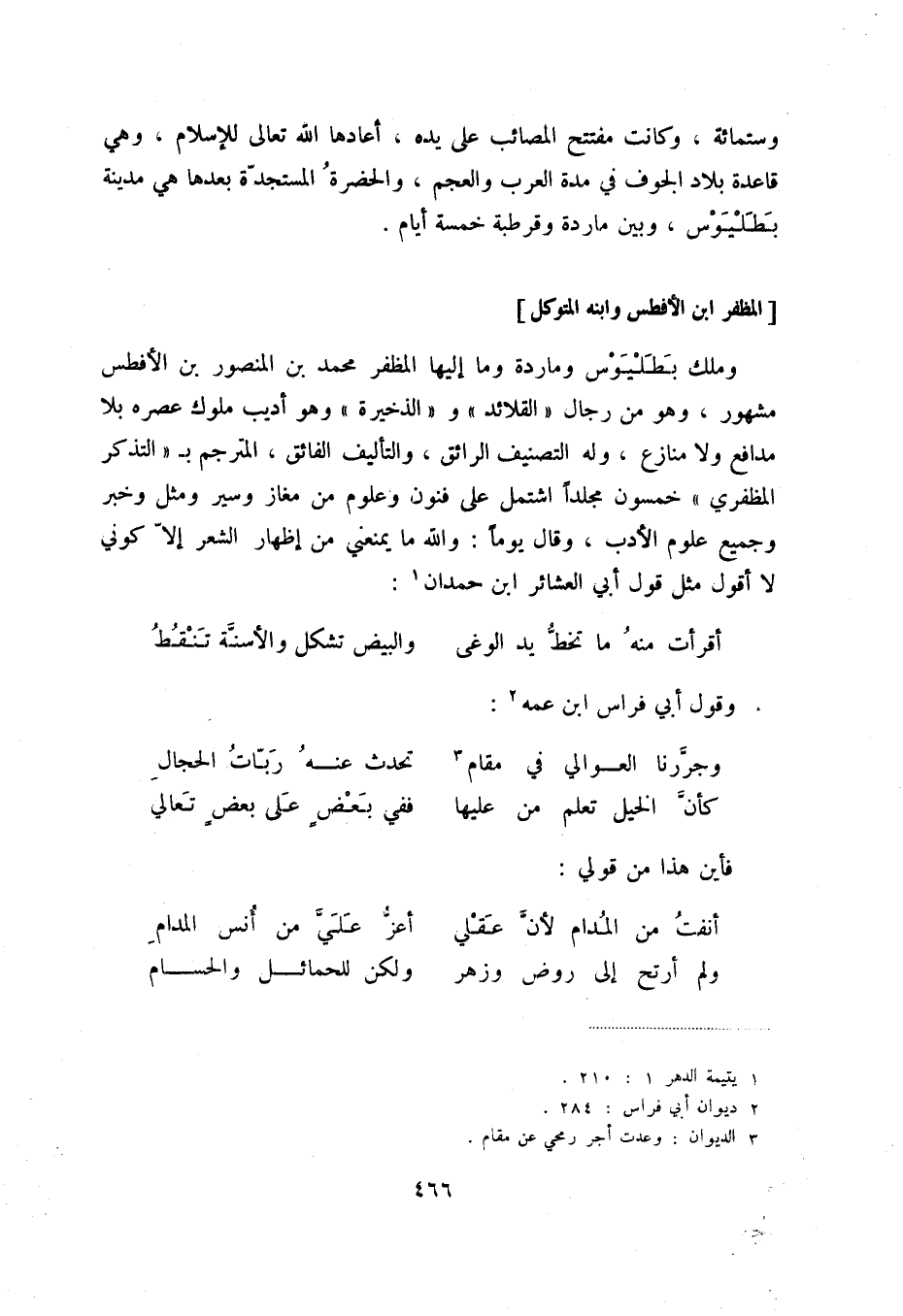 وملك بطليوس وماردة وما إليها المظفر بن المنصور بن الأفطس مشهور، وهو من رجال القلائد والذخيرة وهو أديب ملوك عصره بلا مدافع ولا منازع، وله التصنيف الرائق، والتأليف الفائق، المترجم بالتذكر المظفري خمسون مجلداً اشمل على فنون وعلوم من مغاز وسير ومثل وأخبار وجميع علوم الأدب، وقال يوماً: والله ما يمنعني من إظهار الشعر إلا كوني لا أقول مثل قول أبي العشائر ابن حمدان (1) :