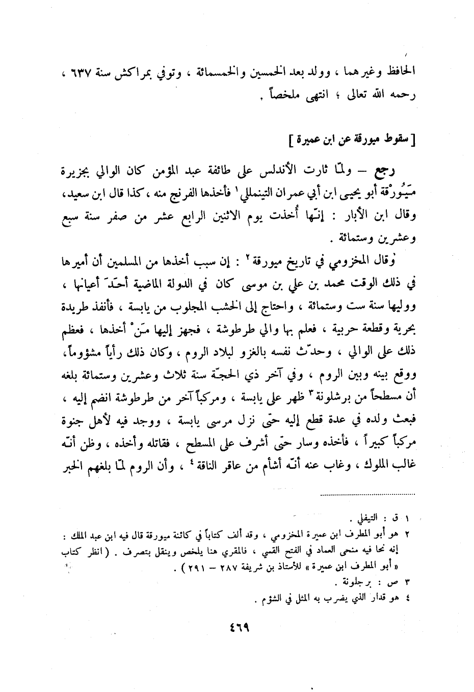 وقال المخزومي في تاريخ ميورقة (2) : إن سبب أخذها من المسلمين أن أميرها محمد بن علي بن موسى كان في الدولة الماضية أحد أعيانها، ووليها سنة ست وستمائة، واحتاج إلى الخشب المجلوب من اليابسة، فأنفذ طريدة بحرية وقطعة حربية، فعلم بها والي طرطوشة، فجهز إليها من أخذها، فعظم ذلك على الوالي، وحدث نفسه بالغزو لبلاد الروم، وكان ذلك رأياً مشؤوماً، ووقع بينه وبين الروم، وفي آخر ذي الحجة سنة ثلاث وعشرين وستمائة بلغه أن مسطحاً من برشلونة (3) ظهر على يابسة، ومركباً آخر من طرطوشة انضم إليه، فبعث ولده في عدة قطع إليه حتى نزل مرسى يابسة، ووجد فيه لأهل جنوة مركباً كبيراً، فأخذه وسار حتى وصل إلى المسطح، فقاتله وأخذه، وظن أنه غاب الملوك، وغاب عنه أنه أشأم من عاقر الناقة (4) ، وأن الروم لما بلغهم الخبر