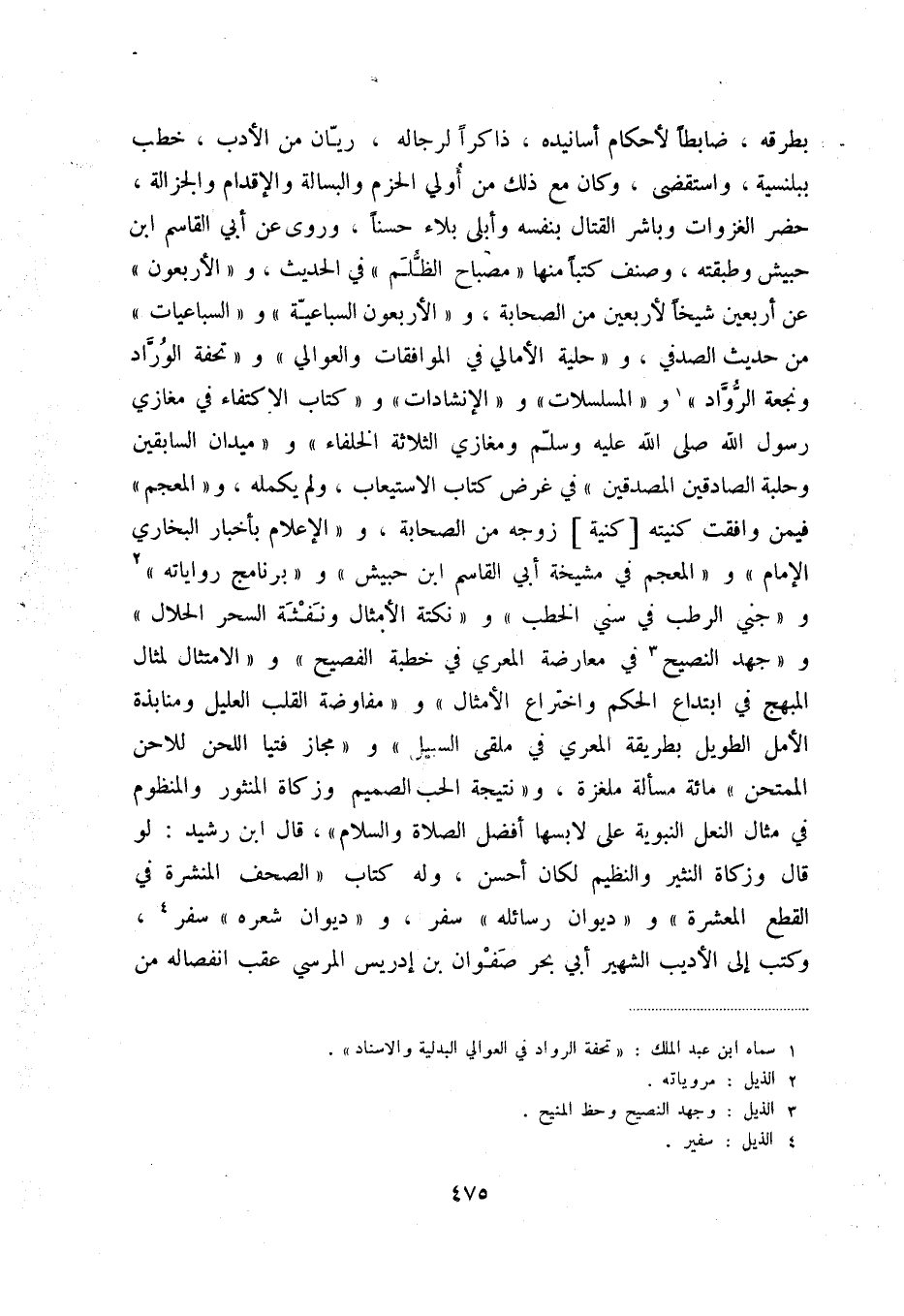 بطرقه، ضابطاً لأحكام أسانيده، ذاكراً لرجاله، ريان من الأدب، خطب ببلنسية، واستقضى، وكان مع ذلك من أولي الحزم والبسالة والإقدام والجزالة، حضر الغزوات وباشر القتال بنفسه وأبلى بلاء حسناً، وروى عن أبي القاسم ابن حبيش وطبقته، وصنف كتباً منها مصباح الظلم في الحديث، والأربعون عن أربعين شيخاً لأربعين من الصحابة، والأربعون السباعية والسباعيات من حديث الصدفي، وحلية الأمالي في الموافقات والعوالي و " تحفة الوراد ونجعة الرواد " (1) والمسلسلات والإنشادات وكتاب الاكتفاء في مغازي رسول الله صلى الله عليه وسلم ومغازي الثلاثة الخلفاء، وميدان السابقين وحلبة الصادقين المصدقين في غرض كتاب الاستيعاب، ولم يكمله، والمعجم فيمن وافقت كنيته [كنية] زوجه من الصحابة، والإعلام بأخبار البخاري الإمام والمعجم في مشيخة أبي القاسم ابن حبيش، و " برنامج رواياته " (2) وجنى الرطب في سني الخطب ونكتة الأمثال ونفثة السحر الحلال، و " جهد النصيح (3) في معارضة المعري في خطبة الفصيح "، والامتثال لمثال المبهج في ابتداع الحكم واختراع الأمثال ومفاوضة القلب العليل ومنابذة الأمل الطويل بطريقة المعري في ملقى السيل، ومجاز فتيا اللحن للاحن الممتحن مائة مسألة ملغزة، ونتيجة الحب الصميم وزكاة المنثور والمنظوم في مثال النعل النبوية على لابسها أفضل الصلاة والسلام، قال ابن رشيد: لو قال وزكاة النثير والنظيم لكان أحسن، وله كتاب الصحف المنشرة في القطع المعشرة وديوان رسائل سفر، وديوان شعره سفر (4) ، وكتب إلى الأديب الشهير أبي بحر صفوان بن إدريس المرسي عقب انفصاله من