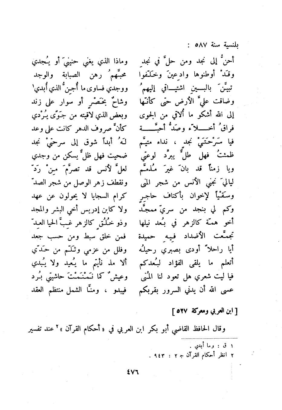 تبين بالبين اشتياقي إليهم ... ووجدي فساوى ما أجن الذي أبدي (1) وضاقت علي الأرض حتى كأنها وشاح على بخصر أو سوار على زند