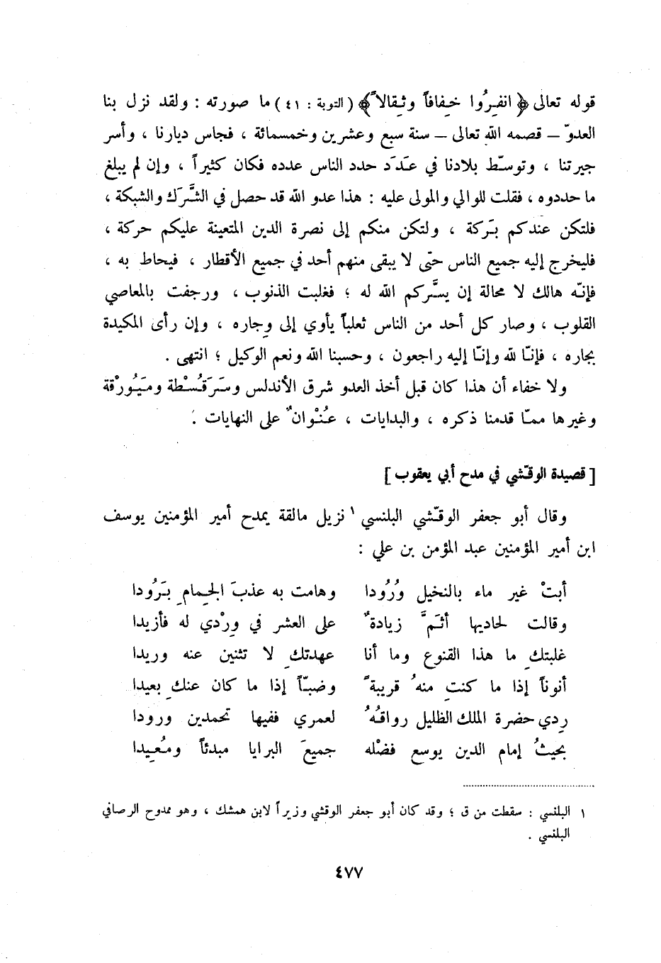 قوله تعالى انفروا خفافاً وثقالاً ما صورته: ولقد نزل بنا العدو - قصمه الله تعالى - سنة سبع وعشرين وخمسمائة، فجاس ديارنا، وأسر جيرتنا، وتوسط بلادنا في عدد حدد الناس عدده فكان كثيراً، وإن لم يبلغ ما حددوه، فقلت للوالي والمولى عليه: هذا عدو الله قد في الششرك والشبكة، فلتكن عندكم بركة، ولتكن منكم إلى نصرة الدين المتعينة عليكم حركة، فليخرج عليه جميع الناس حتى لا يبقى منهم أحد في جميع الأقطار، فيحاط به، فإنه هالك لا محالة إن يسركم الله له، فغلبت الذنوب، ورجفت بالعاصي القلوب، وصار كل أحد من الناس ثعلباً يأوي إلى وجاره، وإن رأى المكيدة بجاره، فإن لله وإنا إليه راجعون، وحسبنا الله ونعم الوكيل، عنوان على النهايات.