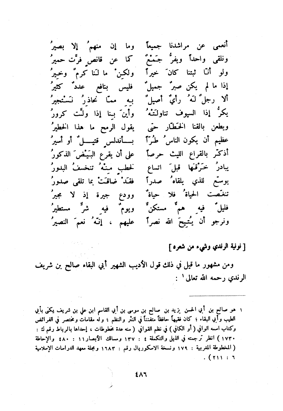 (1) هو صالح بن أبي الحسن يزيد بن صالح بن موسى بن أبي القاسم ابن علي بن شريف يكنى بأبي الطيب وأبي البقاء؛ كان فقيهاً حافظاً متفنناً في النثر والنظم؛ وله مقامات ومختصر في الفرائض وكتاب اسمه الوافي (أو الكافي) في نظم القوافي (منه عدة مخطوطات، إحداها بالرباط رقم ك: 1730) انظر ترجمته في الذيل والتكملة 4: 137 ومسالك الأبصار 11: 480 والإحاطة (المخطوطة المغربية: 179 ونسخة الإسكوريال رقم: 1683 ومجلة معهد الدراسات الإسلامية 6: 211) .