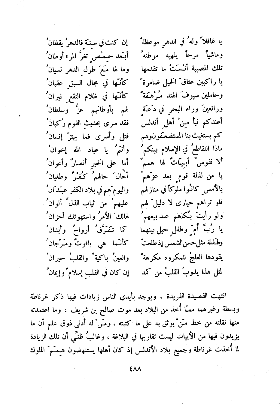 انتهت القصيدة الفريدة، ويوجد بأيدي الناس زيادات فيها ذكر غرناطة وبسطة وغيرهما مما أخذ من البلاد بعد موت صالح بن شريف، وما اعتمدته منها نقلته من خط من يوثق به على ما كتبته، ومن له أدنى ذوق علم أن ما يزيدون فيها من الأبيات ليست تقاربها في البلاغة، وغالب ظني أن تلك الزيادة لما أخذت غرناطة وجميع بلاد الأندلس إذ كان أهلها يستنهضون همم الملوك