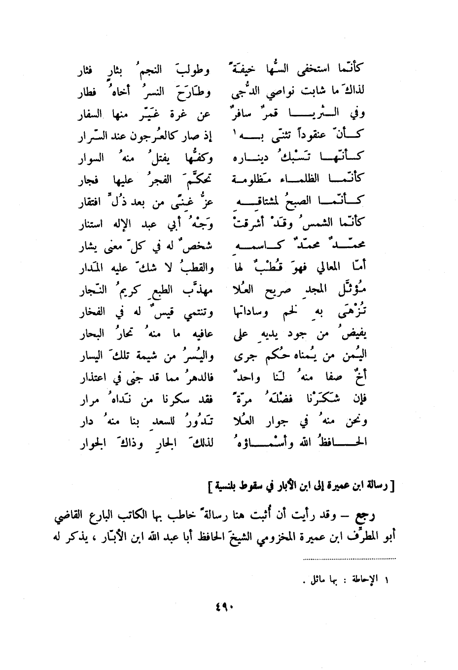 رجع - وقد رأيت أن أثبت هنا رسالة خاطب بها الكاتب البارع القاضي أبو المطرف ابن عميرة المخزومي الشيخ أبا عبد الله ابن الأبار، يذكر له