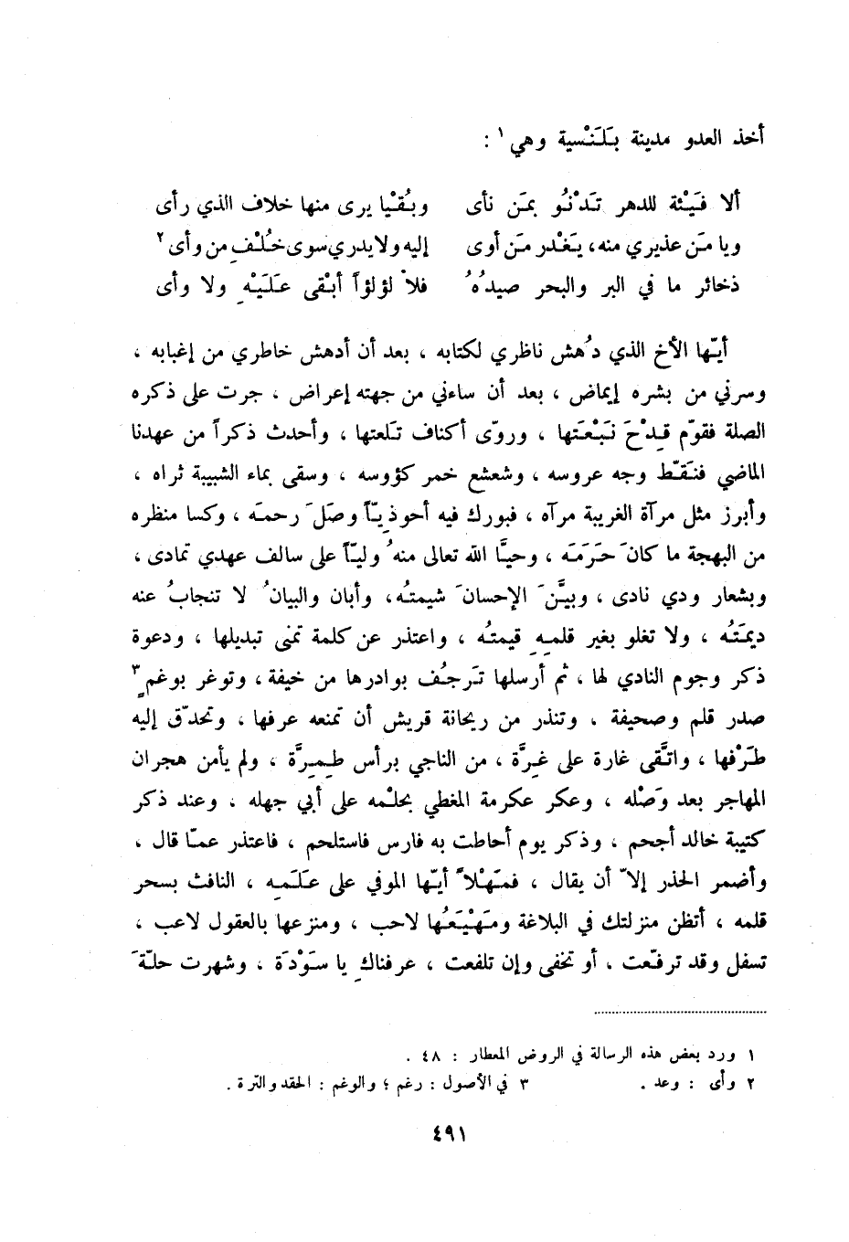 أيها الأخ الذي دهش ناظري لكتابه، بعد أن أدهش خاطري من إغبابه، وسرني من بشره إيماض، بعد أن ساءني من جهته إعراض، جرت على ذكره الصلة فقوم قدح نبعتها، وروى أكناف تلعتها، وأحدث ذكراً من عهدنا الماضي فنقط وجه عروسه، وشعشع خمر كؤوسه، وسقى بماء الشبيبة ثراه، وأبرز مثل مرآة الغريبة مرآه، فبورك فيه أحوذياً وصل رحمه، وكسا منظره من البهجة ما كان حرمه، وحيا الله تعالى منه ولياً على سالف عهدي تمادى، وبشعار ودي نادى، وبين الإحسان شيمته، وأبان والبيان لا تنجاب عنه ديمته، ولا تغلو بغير قلمه قيمته، واعتذر عن كلمة تمنى تبديلها، ودعوة ذكر وجوم النادي لها، ثم أرسلها ترجف بوادرها من خيفة، وتوغر بوغم (3) صدر قلم وصحيفة، وتنذر من ريحانه قريش أن تمنعه عرفها، وتحدق إليه طرفها، واتقى غارة على غرة، من الناجي برأس طمرة، ولم يأمن هجران المهاجر بعد وصله، وعكر عكرمة المغطي بحلمه على أبي جهله، وعند ذكر كتيبة خالد أجحم، وذكر يوم أحاطت به فارس فاستلحم، فاعتذر عما قال، وأضمر الحذر إلا أن يقال، فمهلاً أيها الموفي على علمه، النافث بسحر قلمه، أتظن منزلتك في البلاغة ومهيعها لاحب، ومنزعها بالعقول لاعب، تسفل وقد ترفعت، أو تخفى وإن تلفعت، عرفناك يا سودة، وشهرت حلة
