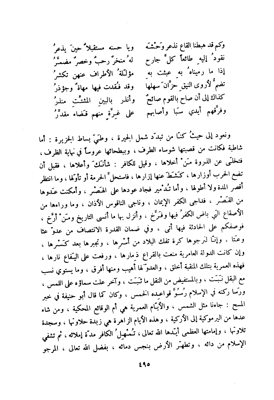 ونعود إلى حيث كنا من تبدد شمل الجيرة، وطي بساط الجزيرة: أما شاطبة فكانت من قصبتها شوساء الطرف، وببطحائها عروساً في نهاية الظرف، فتخلى عن الذروة من أخلاها، وقيل الكافر: شأنك وأعلاها، فقبل أن تضع الحرب أوزارها، كشط عنها إزارها، فاستحل الحرمة أو تأولها، وما انتظر أقصر المدة ولا أطولها، وأما تدمير فجاد عودها على الهصر، وأمكنت عدوها من القصر، فداجى الكفر الإيمان، وناجى الناقوس الأذان، وما وراءها من الأصقاع التي باض الكفر فيها وفرخ، وأنزل بها ما أنسى التاريخ ومن أرخ، فوصفكم على الحادثة فيها أتى، وفي ضمان القدرة الانتصاف من عدو عثا وعتا، وإنا لنرجوها كرة تفك البلاد من أسرها، وتجبرها بعد كسرها، وإن كانت الدولة العامرية منعت بالقراع ذمارها، ورفعت على اليفاع نارها، فهذه العمرية بتلك المنقبة أخلق، والعدو لها أهيب ومنها أفرق، وما يستوي نسب مع البقل نبت، وبالمستفيض من النقل ما ثبت، وآخر علت سماؤه على اللمس، ورسا ركنه في الإسلام رسو قواعده الخمس، وكان كما قال أبو حنيفة في خبر المسح: جاءنا مثل الشمس، والأيام العمرية هي أم الوقائع المحكية، ومن شاء عدها من اليرموكية إلى الأركية، وهذه الأيام الزاهرة هي زبدة حلاوتها، وسجدة تلاوتها، وإمامتها العظمى أيدها الله تعالى، تمهل الكافر مدة إملائه، ثم تشفي الإسلام من دائه، وتطهر الأرض بنجس دمائه، بفضل الله تعالى، المرجو