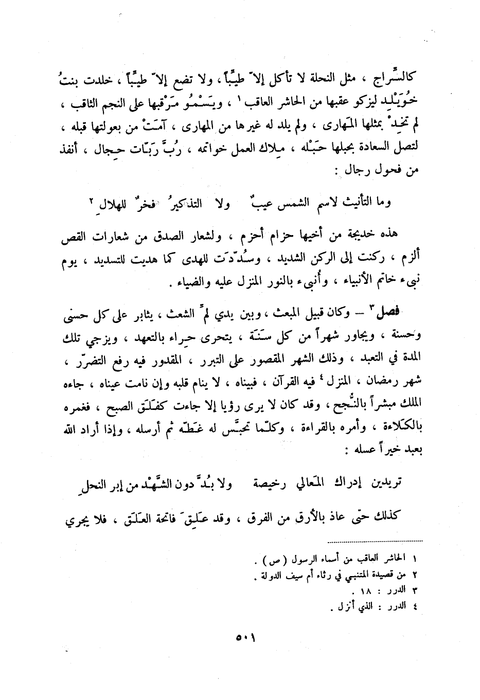 وما التأنيث لاسم الشمس عيبٌ ... ولا التذكير فخرٌ للهلال (2) هذه خديجة من أخيها حزام أحزم، ولشعار الصدق من شعارات القص ألزم، ركنت إلى الركن الشديد، وسددت للهدى كما هديت للتسديد، يوم نبىء خاتم الأنبياء، وأنبىء بالنور المنزل عليه والضياء.