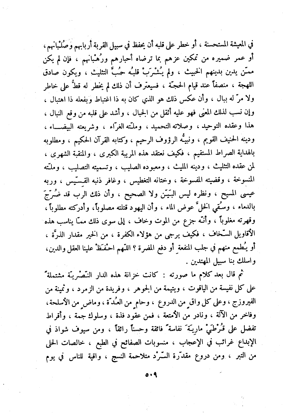 في المعيشة المستحسنة، أو خطر على قلبه أن يحفظ في سبيل القربة أربابهم وصلبانهم، أو عمر ضميره من تمكين عزمهم بما ترضاه أحبارهم ورهبانهم، فإن لم يكن ممن يدين بدينهم الخبيث، ولم يشرب قبله حب التثليث، ويكون صادق اللهجة، منصفاً عند قيام الحجة، فسيعترف أن ذلك لم يخطر له قط على خاطر ولا مر له ببال، وأن عكس ذلك هو الذي كان به ذا اغتباط وبفعله ذا اهتبال، وإن نسب لذلك المعنى فهو عليه أثقل من الجبال، وأشد على قلبه من وقع النبال، هذا وعقده التوحيد، وصلاته التحميد، وملته الغراء، وشريعته البيضاء، ودينه الحنيف القويم، ونبيه الرؤوف الرحيم، وكتابه القرآن الحكيم، ومطلوبه بالهداية الصراط المستقيم، فكيف نعتقد هذه المريبة الكبرى، والمنقبة الشهرى، لمن عقده التثليث، ودينه المليث، ومعبوده الصليب، وتسميته التصليب، وملته المنسوخة، وقضيته المفسوخة، وختانه التغطيس، وغافر ذنبه القسيس، وربه عيسى المسيح، ونظره ليس البين ولا الصحيح، وأن ذلك الرب قد ضرج بالدماء، وسقي الخل عوض الماء، وأن اليهود قتلته مصلوباً، وأدركته مطلوباً، وقهرته مغلوباً، وأنه جزع من الموت وخاف، إلى سوى ذلك مما يناسب هذه الأقاويل السخاف، فكيف يرجى من هؤلاء الكفرة، من الخير مقدار الذرة، أو يطمع منهم في جلب المنفعة أو دفع المضرة اللهم احفظ علينا العقل والدين، واسلك بنا سبيل المهتدين.