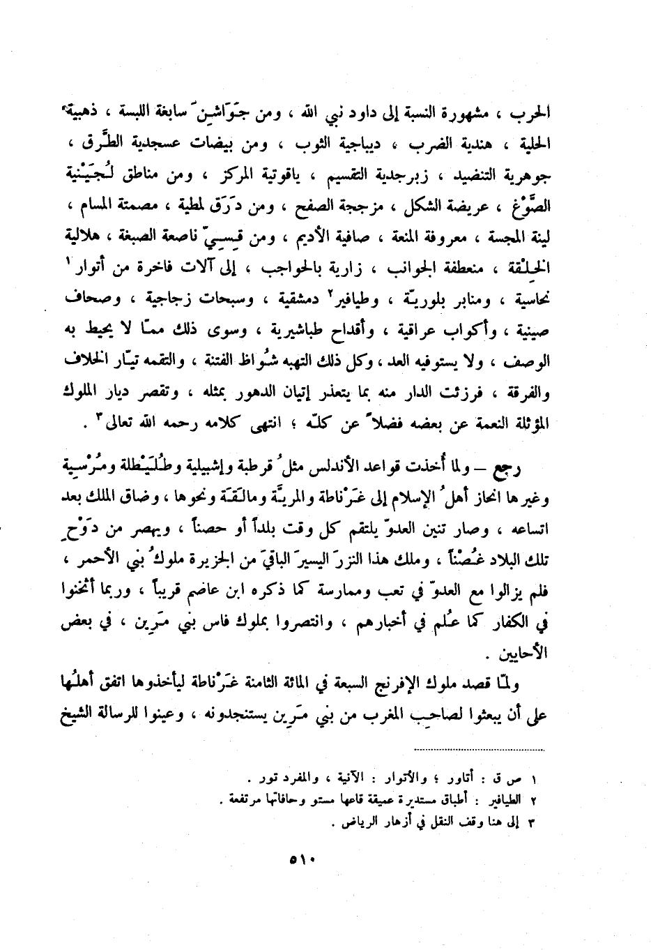 الحرب، مشهورة النسبة إلى داوود نبي الله، ومن جواشن سابغة اللبسة، ذهبية الحلية، هندية الضرب، ديباجية الثوب، ومن بياضات عسجدية الطرق، جوهرية التنضيد، وزبرجدية التقسيم، ياقوتية المركز، ومن نطاق لجينية الصوغ، عريضة الشكل، مزججة الصفح، ومن درق لمطية، مصمتة المسام، لينة المجسة، معروفة المنعة، صافية الأديم، ومن قسي ناصعة الصبغة، هلالية الخلقة، منعطفة الجوانب، زارية بالحواجب، إلى آلات فاخرة من أتوار (1) نحاسية، ومنابر بلورية، وطيافير (2) دمشقية، وسبحات زجاجية، وصحاف صينية، وأكواب عراقية، وأقداح طباشيرية، وسوى ذلك مما لا يحيط به الوصف، ولا يستوفيه العد، وكل ذلك التهبه شواظ الفتنة، والتقمه تيار الخلاف والفرقة، فرزئت الدار منه بما يتعذر إتيان الدهور بمثله، وتقصر ديار الملوك المؤثلة النعمة عن بعضه فضلاً عن كله؛ انتهى كلامه رحمه الله تعالى (3) .