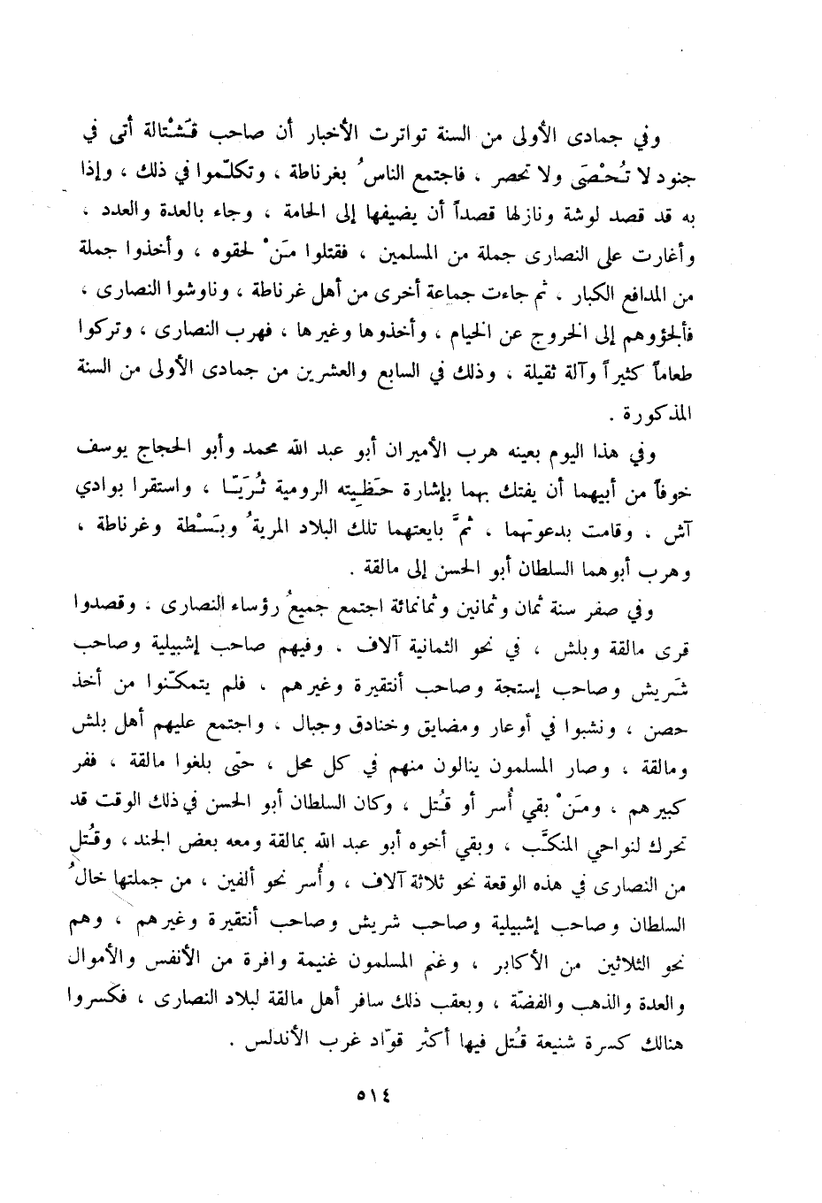 وفي صفر سنة ثمان وثمانين وثمانمائة اجتمع جميه رؤساء النصارى، وقصدوا قرى مالقة وبلش، في نحو الثمانية آلاف، وفيهم صاحب إشبيلية وصاحب شريش وصاحب إستجة وصاحب أنتقيرة وغيرهم، فلم يتمكنوا من أخذ حصن، ونشبوا في أوعار ومضايق وخنادق وجبال، واجتمع عليهم أهل بلش ومالقة، وصار المسلمون ينالون منهم في كل محل، حتى بلغوا مالقة، ففر كبيرهم، ومن بقي أسر أو قتل، وكان السلطان أبو الحسن في ذلك الوقت قد تحرك لنواحي المنكب، وبقي أخوه أبو عبد الله بمالقة ومعه بعض الجند، وقتل من النصارى في هذه الوقعة نحو ثلاثة آلاف، وأسر نحو ألفين، ومن جملتها خال السلطان وصاحب إشبيلية وصاحب شريش وصاحب أنتقيرة وغيرهم، وهم نحو الثلاثين من الأكابر، وغنم المسلمون غنيمة وافرة من الأنفس والأموال والعدة والذهب والفضة، وبعقب ذلك سافر أهل مالقة لبلاد النصارى، فكسوا هنالك كسرة شنيعة قتل فيها أكثر قواد غرب الأندلس.