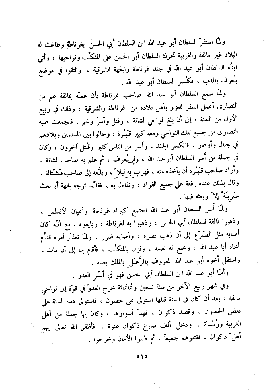 ولما سمع السلطان أبو عبد الله صاحب غرناطة بأن عمه بمالقة غنم من النصارى أعمل السفر للغزو بأهل بلاده من غرناطة والشرقية، وذلك في ربيع الأول من السنة، إلى أن بلغ نواحي لشانة، وقتل وأسر وغنم، فتجمعت عليه النصارى من جميع تلك النواحي ومعه كبير قبرة، وحالوا بين المسلمين وبلادهم في جبال وأوعار، فانكسر الجند، وأسر من الناس كثير وقتل آخرون، وكان في جملة من أسر السلطان أبو عبد الله، ولم يعرف، ثم علم به صاحب لشانة، وأراد صاحب قبرة أن يأخذ منه، فهرب به ليلاً، وبلغه إلى صاحب قشتالة، ونال بذلك عنده رفعة على جميع القواد، وتفاءل به، فقلما توجه لجهةٍ أو بعث سريةً إلا وبعثه فيها.