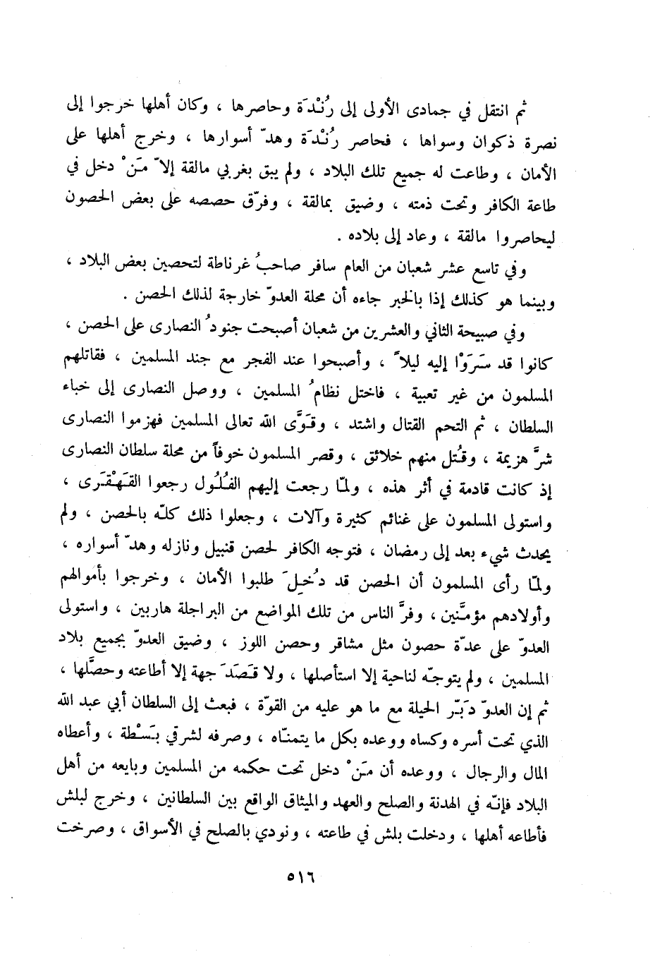 وفي صبيحة الثاني والعشرين من شعبان أصبحت جنود النصارى على الحصن، كانوا قد سروا إليه ليلاً، وأصبحوا عند الفجر مع جند المسلمين، فقاتلهم المسلمون من غير تعبية، فاختل نظام المسلمين، ووصل النصارى إلى خباء السلطان، ثم التحم القتال واشتد، وقوى الله تعالى المسلمين فهزموا النصارى شر هزيمة، وقتل منهم خلائق، وقصر المسلمون خوفاً من محلة السلطان النصارى إذ كانت قادمة في أثر هذه، ولما رجعت إليهم الفلول رجعوا القهقرى، واستولى المسلمون على غنائم كثيرة وآلات، وجعلوا ذلك كله بالحصن، ولم يحدث شيء بعد إلى رمضان، فتوجه الكافر إلى حصن قنبيل ونازله وهد أسواره، ولم رأى المسلمون أن الحصن قد دخل طلبوا الأمان، وخرجوا بأموالهم وأولادهم مؤمنين، وفر الناس من تلك المواضع مع البراجلة هاربين، واستولى العدو على عدة حصون مثل مشاقر وحصن اللوز، وضيق العدو بجميع بلاد المسلمين، ولم يتوجه إلى ناحية إلا استأصلها، ولا قصد جهة إلا أطاعته وحصلها، ثم إن العدو دبر الحيلة مع ما هو عليه من القوة، فبعث إلى السلطان أبي عبد الله الذي تحت أسره وكساه ووعده بكل ما يتمناه، وصرفه لشرقي بسطة، وأعطاه المال والرجال، ووعده أن من دخل تحت حكمه من المسلمين وبايعه من أهل البلاد فإنه في الهدنة والصلح والعهد والميثاق الواقع بين السلطانين، وخرج لبلش فأطاعه أهلها، ودخلت بلش في طاعته، ونودي بالصلح في الأسواق، وصرخت