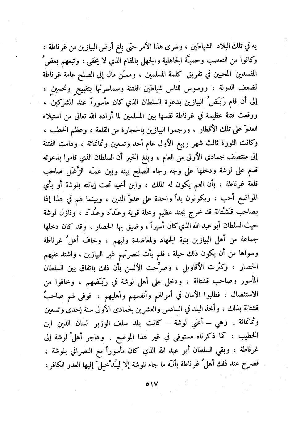 به في تلك البلاد الشياطين، وسرى هذا الأمر حتى بلغ أرض البيازين من غرناطة، وكانوا من التعصب وحمية الجاهلية والجهل بالمقام الذي لا يخفى، وتبعهم بعض المفسدين المحبين في تفريق كلمة المسلمين، وممن مال إلى الصلح عامة غرناطة لضعف الدولة، ووسوس للناس شياطين الفتنة وسماسرتها بتقبيحٍ وتحسينٍ، إلى أن قام ربض البيازين بدعوة السلطان الذي كان مأسوراً عند المشركين، ووقعت فتنة عظيمة في غرناطة نفسها بين المسلمين لما أراده الله تعالى من استيلاء العدو على تلك الأقطار، ورجموا البيازين بالحجارة من القلعة، وعظم الخطب، وكانت الثورة ثالث شهر ربيع الأول عام أحد وتسعين وثمانمائة، ودامت الفتنة إلى منتصف جمادى الأولى من العام، وبلغ الخبر أن السلطان الذي قاموا بدعوته قدم على روشة ودخلها على وجه رجاء الصلح بينه وبين عمه الزغل صاحب قلعة غرناطة، بأن العم يكون له الملك، وابن أخيه تحت إيالته بلوش أو بأي المواضع أحد، ويكونون يداً واحدة على عدو الدين، وبينهم في هذا إذا بصاحب قشتالة قد خرج بجند عظيم ومحلة قوية وعدد وعدد، ونازل لوشة حيث السلطان أبو عبد الله الذي كان أسيراً، وضيق بها الحصار، وكان قد دخلها جماعة من أهل البيازين بنية الجهاد ولمعاضدة وليهم، وخاف أهل غرناطة وسواها من أن يكون ذلك حيلة، فلم يأت لنصرته غيرالبيازين، واشتد عليهم الحصار، وكثرت الأقاويل، وصرحت الألسن بأن ذلك باتفاق بين السلطان المأسور وصاحب قشتالة، ودخل على أهل لوشة في ربضهم، وخافوا من الاستئصال، فطلبوا الأمان في أموالهم وأنفسهم وأهليهم، فوفى لهم صاحب قشتالة بذلك، وأخذ البلد في السادس والعشرين لجمادى الأولى سنة إحدى وتسعين وثمانمائة. وهي - أعني لوشة - كانت بلد سلف الوزير لسان الدين ابن الخطيب، كما ذكرناه مستوفى في غير هذا الموضع، وهاجر أهل لوشة إلى غرناطة، وبقي السلطان أبو عبد الله الذي كان مأسوراً مع النصراني في لوشة، فصرح عند ذلك أهل غرناطة بأنه ما جاء للوشة إلا ليدخل إليها العدو الكافر