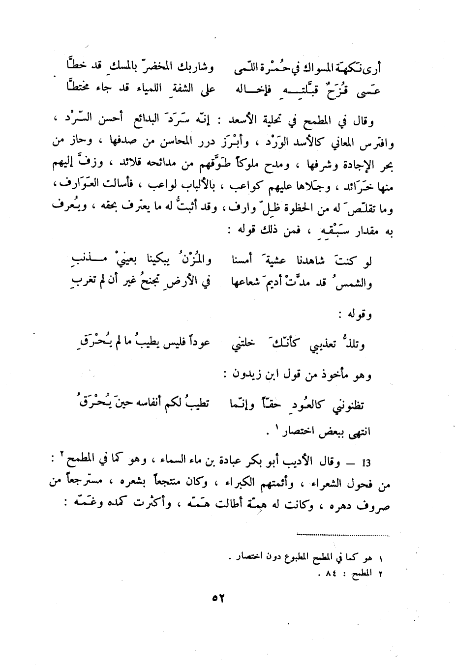 13 - وقال الأديب أبو بكر عبادة بن ماء السماء، وهو كما في المطمح (2) : من فحول الشعراء، وأئمتهم الكبراء، وكان منتجعاً بشعره، مسترجعاً من صروف دهره، وكانت له همة أطالت همه، وأكثرت كمده وغمه: