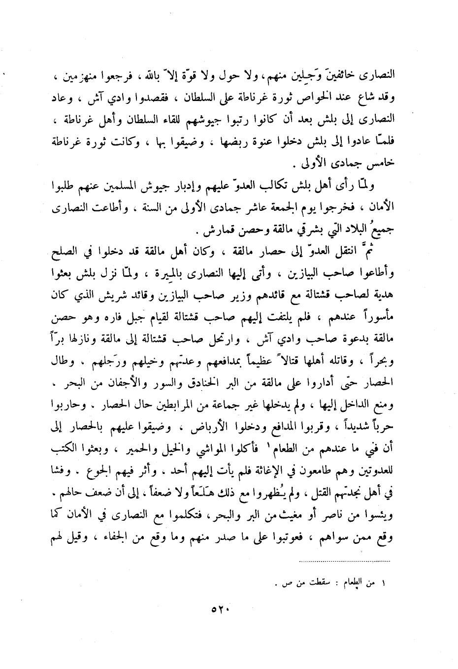النصارى خائفين وجلين منهم، ولا حول ولا قوة إلا بالله، فرجعوا منهزمين، وقد شاع عند الخواص ثورة غرناطة على السلطان، فقصدوا وادي آش، وعاد النصارى إلى بلش بعد أن كانوا رتبوا جيوشهم للقاء السلطان وأهل غرناطة، فلما عادوا إلى بلش دخلوا عنوة ربضها، وضيقوا بها، وكانت ثورة غرناطة، خامس جمادى الأولى.