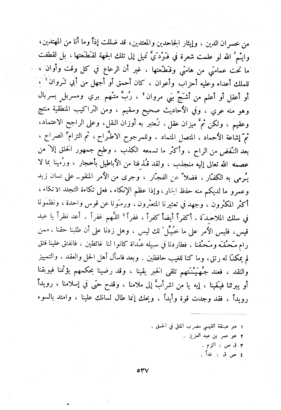 من خسران الدين، وإيثار الجاحدين والمعتدين، قد ضللت إذاً وما أنا من المهتدين، وايم الله لو علمت شعرة في فودي تميل إلى تلك الجهة لقطعتها، بل لقطفت ما تحت عمامتي من هامتي وقطعتها، غير أن الرعاع في كل وقت وأوان، للملك أعداء وعليه أحزاب وأعوان، كان أحمق أو أجهل من أبي ثروان (1) ، أو أعقل أو أعلم من أشج بني مروان (2) ، رب متهم بري ومسربلٍ بسربال وهو منه عري، وفي الأحاديث صحيح وسقيم، ومن التراكيب المنطقية منتج وعقيم، ولكن ثم ميزان عقل، تعتب ربه أوزان النقل، وعلى الراجح الاعتماد، ثم إشاعة الأحماد، المتصل المتماد، وللمرجوح الاطراح، ثم التزام (3) الصراح، بعد النفض من الراح، وأكثر ما تسمعه الكذب، وطبع جمهور الخلق إلا من عصمه الله تعالى إليه منجذب، ولقد قذفنا من الأباطيل بأحجار، ورمينا بما لا يرمى به الكفار، فضلاً عن الفجار، وجرى من الأمر المنقول على لسان زيد وعمر ما لديكم منه حفظ الجار، وإذا عظم الإنكاء، فعلى تكاءة التجلد الاتكاء، أكثر المكثرون، وجهد في تعثيرنا المتعثرون، ورمونا عن قوس واحدة، ونظمونا في سلك الملاحدة، أكفراً أيضاً كفراً، غفراً (4) اللهم غفراً، أعد نظراً يا عبد قيس، فليس الأمر على ما خيل لك ليس، وهل زدنا على أن طلبنا حقنا، ممن رام محقه ومحقنا، فطاردنا في سبيله عداة كانوا لنا غائظين، فانفتق علينا فتقٌ لم يمكنا له رتق، وما كنا للغيب حافظين. وبعد فاسأل أهل الحل والعقد، والتمييز والنقد، فعند جهينتهم تلقى الخبر يقينا، وقد رضينا بحكمهم يؤثمنا فيوبقنا أو يبرئنا فيقينا، إيه يا من اشرأب إلى ملامنا، وقدح حتى في إسلامنا، رويداً رويداً، فقد وجدت قوةً وأيداً، ويحك إنما طال لسانك علينا، وامتد بالسوء