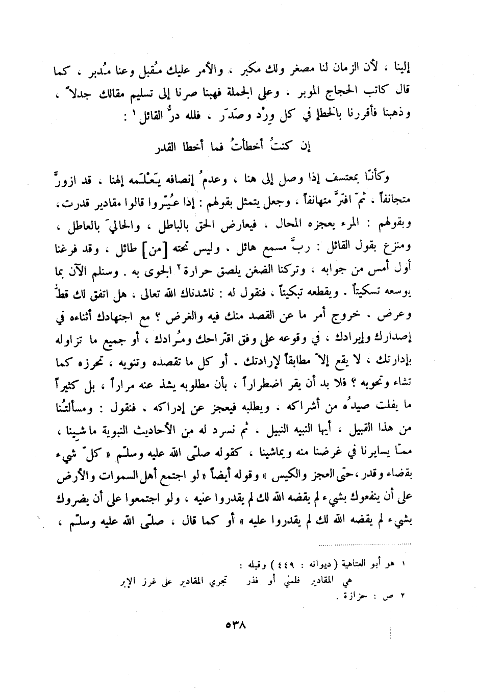 " إن كنت أخطأت فما أخطأ القدر " ... وكأنا بمعتسف إذا وصل إلى هنا، وعدم إنصافه يعلمه إلهنا، قد ازور متجانفاً، ثم افتر متهانفاً، وجعل يتمثل بقولهم: إذا عيروا قالوا مقادير قدرت، وبقولهم: المرء يعجزه المحال، فيعارض الحق بالباطل، والحالي بالعاطل، ومنزع بقول القائل: رب مسمع هائل، وليس تحته [من] طائل، وقد فرغنا أول أمس من جوابه، وتركنا الضغن يلصق حرارة (2) الجوى به. وسنلم الآن بما يوسعه تسكيتاً، ويقطعه تبكيتاً، فنقول له: ناشدناك الله تعالى، هل اتفق لك قط وعرض، خروج أمر ما عن القصد منك فيه والغرض مع اجتهادك أثناءه في إصدارك وإيرادك، في وقوعه على وفق اقتراحك ومرادك، أو جميع ما تزاوله بإدارتك، ل يقع إلا مطابقاً لإرادتك، أو كل ما تقصده وتنويه، تحرزه كما تشاء وتحويه فلا بد أن يقر اضطراراً، بأن مطلوبه يشذ عنه مراراً، بل كثيراً ما يفلت صيده من أشراكه. ويطلبه فيعجز عن إدراكه، فنقول: ومسألتنا من هذا القبيل، أيها النبيه النبيل، ثم نسرد له من الأحاديث النبوية ما شينا، مما يسايرنا في غرضنا ويماشينا، كقوله صلى الله عليه وسلم " كل شيء بقضاء وقدر، حتى العجز والكيس " وقوله أيضاً " لو اجتمع أهل السموات والأرض على أن ينفعوك بشيء لم يقضه الله لك لم يقدروا عليه، ولو اجتمعوا على أن يضروك بشيء لم يقضه الله لك لم يقدروا عليه " أو كما قال، صلى الله عليه وسلم،