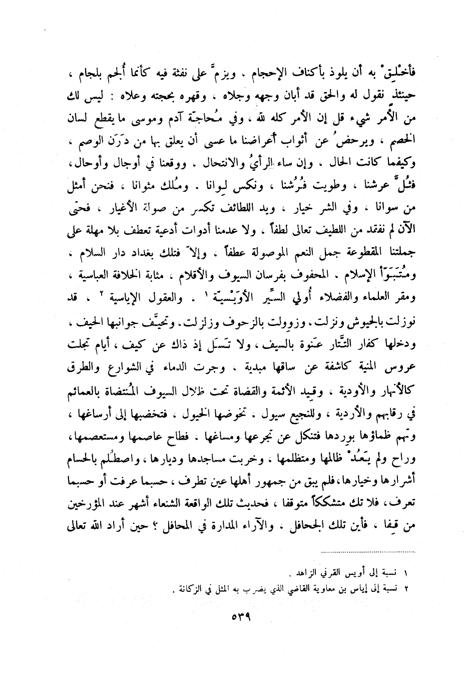 فأخلق أن يلوذ بأكناف الإحجام، ويزم على نفثة فيه كأنما ألجم بلجام، حينئذٍ نقول له والحق قد أبان وجهه وجلاه، وقهره بحجته وعلاه: ليس لك من الأمر شيء قل إن الأمر كله لله، وفي محاجة آدم وموسى ما يقطع لسان الخصم، ويرخص عن أثواب أعراضنا ما عسى أن يعلق بها من درن الوصم، وكيفما كانت الحال، وإن ساء الرأي والانتحال، ووقعنا في أوجال وأوحال، فثل عرشنا، وطويت فرشنا، ونكس لوانا، وملك مثوانا، فنحن أمثل من سوانا، وفي الشر خيار، ويد اللطائف تكسر من صولة الأغيار، فحتى الآن لم نفقد من اللطيف تعالى لطفاً، ولا عدمنا أدوات أدعية تعطف بلا مهلة على جملتنا المقطوعة جمل النعم الموصولة عطفاً، وإلا فتلك بغداد دار السلام، ومتبوأ الإسلام، المحفوف بفرسان السيوف والأقلام، مثابة الخلافة العباسية، ومقر العلماء والفضلاء أولي السير الأويسية (1) ، والعقول الإياسية (2) ، قد نوزلت بالجيوش ونزلت، وزوولتت بالزحوف وزلزلت، وتحيف جوانبها الجيف، ودخلها كفار التتار عنوة بالسيف، ولا تسل إذ ذاك عن كيف، أيام تجلت عروس المنية كاشفة عن ساقها مبدية، وجرت الدماء في الشوارع والطرق كالأنهار والأودية، وقيد الأئمة والقضاة تحت ظلال السيوف المنتضاة بالعمائم في رقابهم والأردية، وللنجيع سيول، تخوضها الخيول، فتخضبها إلى أرساغها، وتهم ظماؤها بوردها فتنكل عن تجرعها ومساغها، فطاح عاصمها ومستعصمها، وراح ولم يعد ظالمها ومتظلمها، وخربت مساجدها وديارها، واصطلم بالحسام أشرارها وخيارها، فلم يبق من جمهور أهلها عين تطرف، حسبما عرفت أو حسبما تعرف، فلا تك متشككاً متوقفاً، فحديث تلك الواقعة الشنعاء أشهر عند المؤرخين من قفا، فأين تلك الجحافل، والآراء المدارة في المحافل حين أراد الله تعالى