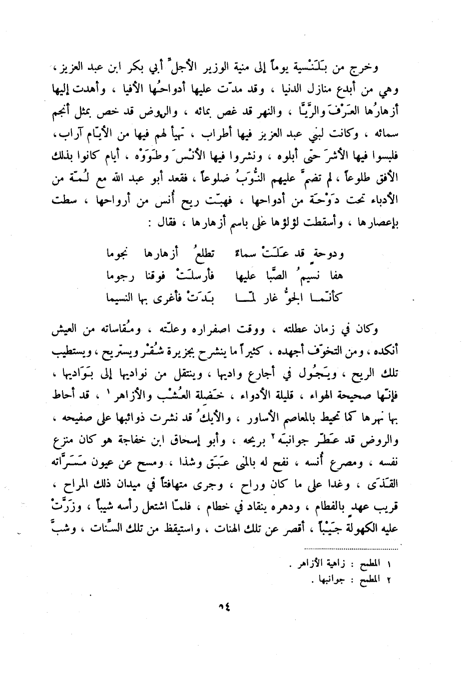 وخرج من بيته يوماً إلى منية الوزير الأجل أبي بكر ابن عبد العزيز وهي من أبدع منازل الدنيا وقدمت عليها أرواحها الأفيا وأهدت إليها أزهارها العرف والرياء والنهر قد غص بمائه والروض قد خص مثل أنجم سمائه، وكانت لبني عبد العزيز فيها أطراب، تهيأ لهم فيها من الأيام آراب، فلبسوا فيها الأشر حتى أبلوه، ونشروا فيها الأنس وطووه، أيام كانوا بذلك الأفق طلوعاً، لم تضم عليهم النوب ضلوعاً، فقعد أبو عبد الله مع لمة من الأدباء تحت دوحة من أدواحها، فهبت ريح أنس من أرواحها، سطت بإعصارها، وأسقطت لؤلؤها على باسم أزهارها، فقال:
