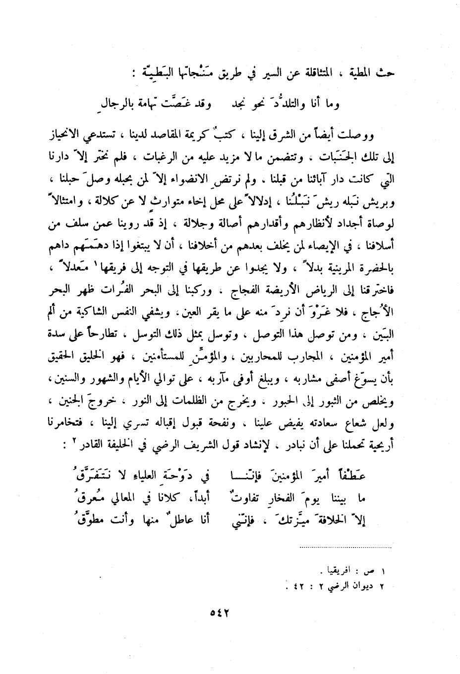 وما أنا والتلدّد نحو نجد ... وقد غصّت تهامة بالرجال ووصلت أيضاً من الشرق إلينا، كتبٌ كريمة المقاصد لدينا، تستدعي الانحياز إلى تلك الجنبات، وتتضمن ما لا مزيد عليه من الرغبات، فلم نختر إلا دارنا التي كانت دار آبائنا من قبلنا، ولم نرتض الإنضواء إلا لمن بحبله وصل حبلنا، وبريش نبله ريش نبلنا، إدلالاً على محل إخاء متوارث لا عن كلالة، وامتثالاً لوصاة أجداد لأنظارهم وأقدارهم أصالة وجلالة، إذ قد روينا عمن سلف من أسلافنا، في الإيصاء لمن يخلف بعدهم من أخلافنا، أن لا يبتغوا إذا دهمهم داهم بالحضرة المرينية بدلاً، ولا يجدوا عن طريقها في التوجه إلى فريقها (1) معدلاً، فاخترقنا إلى الرياض الأريضة الفجاج، وركبنا إلى البحر الفرات ظهر البحر الأجاج، فلا غرو أن نرد منه على ما يقر العين، ويشفي النفس الشاكية من ألم البين، ومن توصل هذا التوصل، وتوسل بمثل ذلك التوسل، تطارحاً على سدة أمير المؤمنين، المحارب للمحاربين، والمؤمن للمستأمنين، فهو الخليق الحقيق بأن يسوغ أصفى مشاربه، ويبلغ أوفى مآربه، على توالي الأيام والشهور والسنين، ويخلص من الثبور إلى الحبور، ويخرج من الظلمات إلى النور، خروج الجنين، ولعل شعاع سعادته يفيض علينا، ونفحة قبول إقباله تسري إلينا، فتخامرنا أريحية تحملنا على أن نبادر، لإنشاد قول الشريف الرضي في الخليفة القادر (2) :