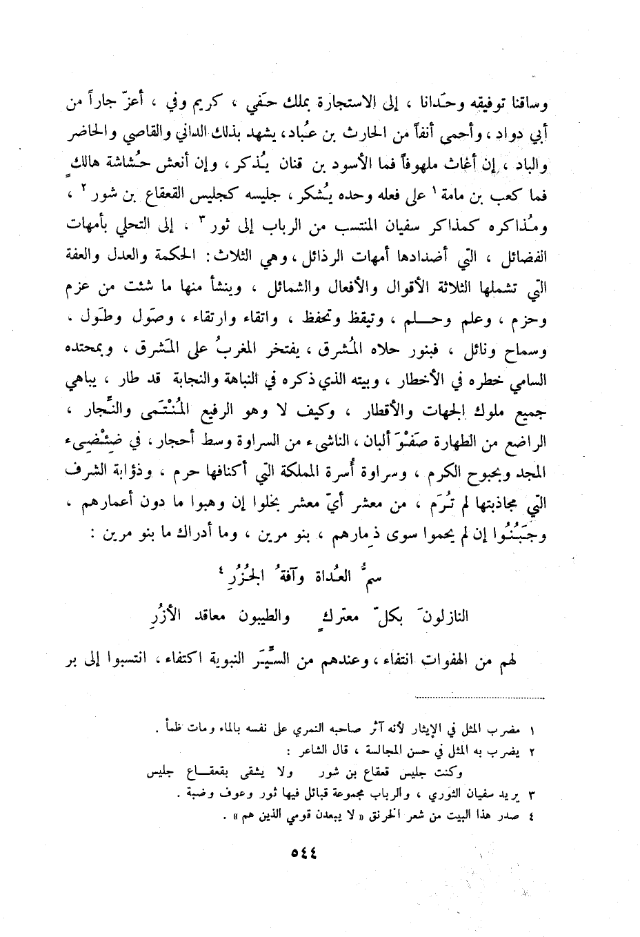 وساقنا توفيقه وحدانا، إلى الإستجارة بملك حفي، كريم وفي، أعز جاراً من أبي داوود، وأحمى أنفاً من الحارث بن عباد، يشهد بذلك الداني والقاصي والحاضر والباد، إن أغاث ملهوفاً فما الأسود ابن قنان يذكر، وإن أنعش حشاشة هالكٍ فما كعب بنم مامة (1) على فعله وحده يشكر، جليسه كجليس القعقاع ابن شور (2) ، ووذاكره كمذاكر سفيان المنتسب من الرباب إلى ثور (3) ، إلى التحلي بأمهات الفضائل، التي أضدادها أمهات الرذائل، وهي الثلاث: الحكمة والعدل والعفة التي تشملها الثلاثة الأقوال والأفعال والشمائل، وينشأ منها ما شئت من عزم وحزم، وعلم وحلم، وتيقظ وتحفظ، واتقاء وارتقاء، وصول وطول، وسماح ونائل، فبنور حلاه المشرق، يفتخر المغرب على المشرق، وبمحتده السامي خطره في الأخطار، وبيته الذي ذكره في النباهة والنجابة قد طار، يباهي جميع ملوك الجهات والأقطار، وكيف لا وهو الرفيع المنتمى والنجار، الراضع من الطهارة صفو ألبان، الناشئ من السراوة وسط أحجار، في ضئضئ المجد وبحبوح الكرم، وسراوة أسرة المملكة التي أكنافها حرم، وذؤابة الشرف التي مجاذبتها لم ترم، من معشر أي معشر بخلوا إن وهبوا ما دون أعمارهم، وجبنوا إن لم يحموا سوى ذمارهم، بنو مرين، وما أدراك ما بنو مرين: