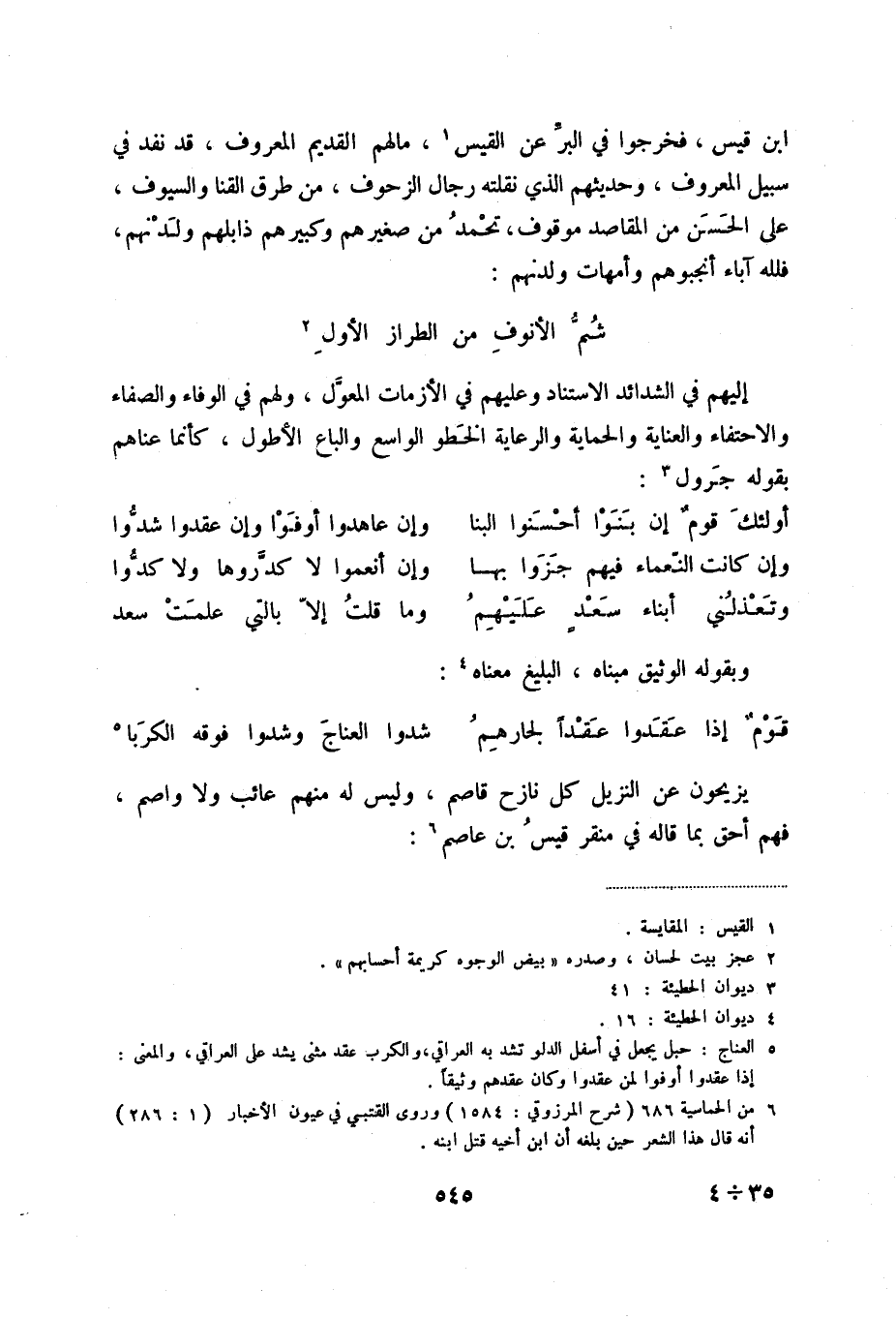 ابن قيس، فخرجوا في البر عن القيس (1) ، ما لهم القديم المعروف، قد نفد في سبيل المعروف، وحديثهم الذي نقلته رجال الزحوف، من طرق القنا والسيوف، على الحسن من المقاصد موقوف، تحمد من صغيرهم وكبيرهم ولدنهم، فلله آباء أنجبوهم وأمهات ولدنهم: