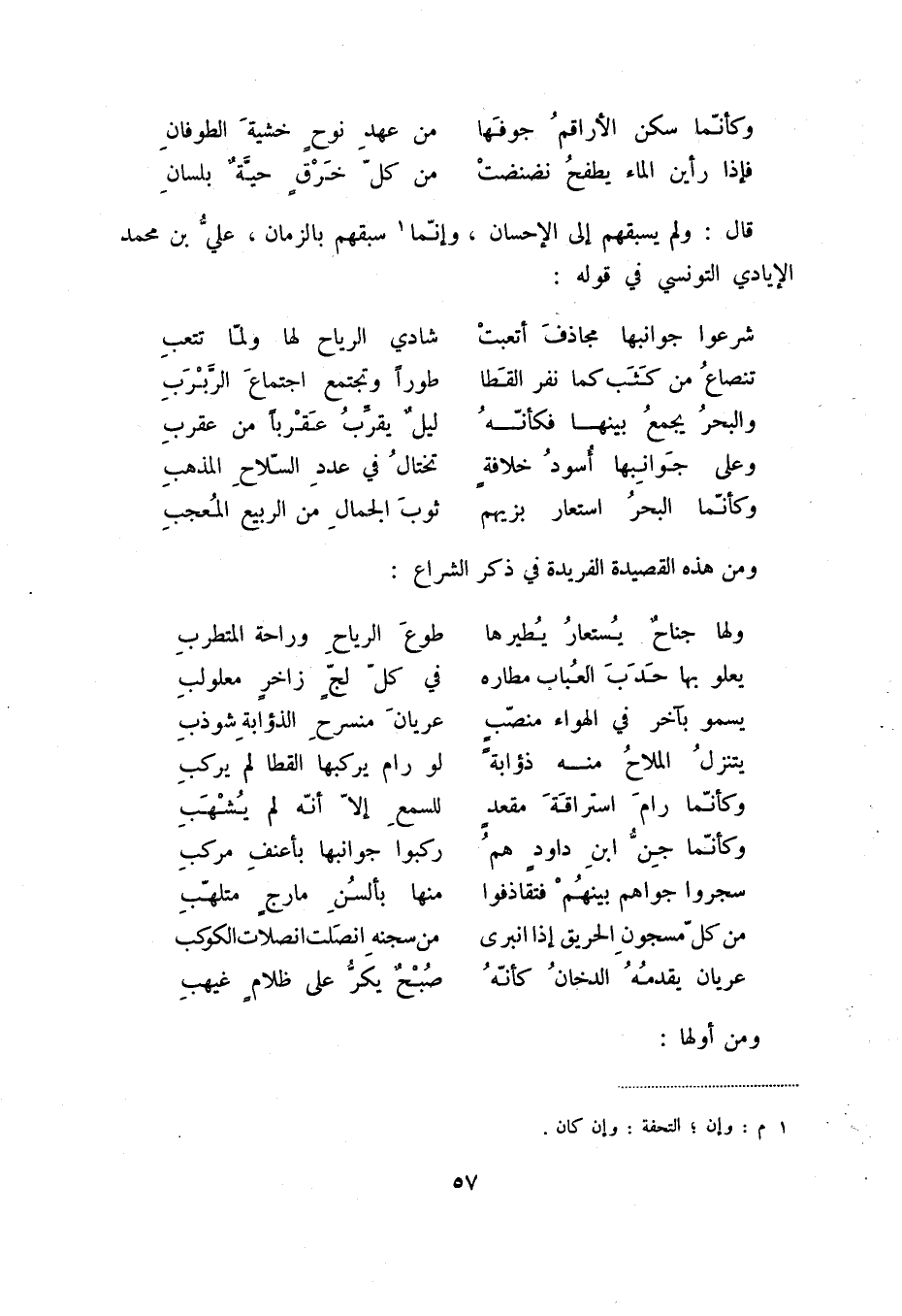 فإذا رأين الماء يطفح نضنضت ... من كل خرق حية بلسان قال: ولم يسبقهم إلى الإحسان، وإنما (1) سبقهم بالزمان، علي بن محمد الإيادي التونسي في قوله: