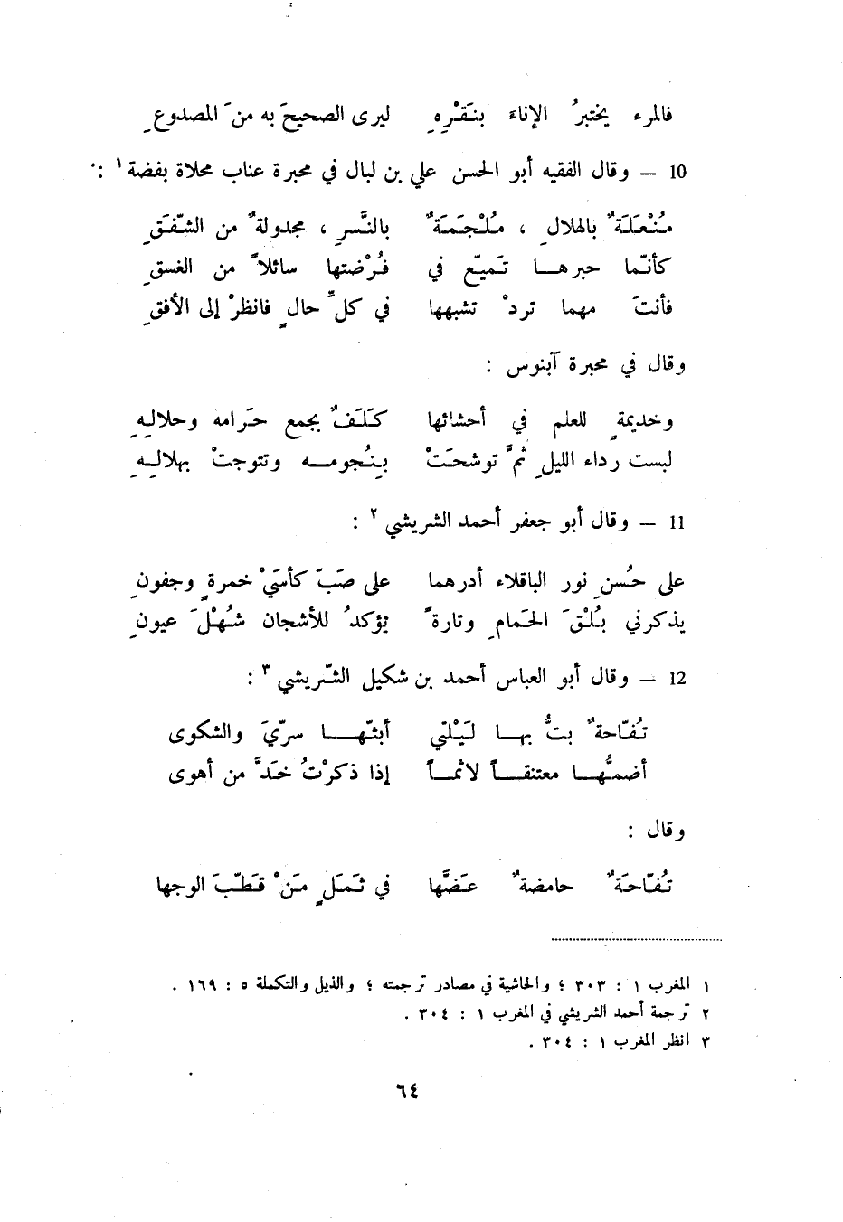 لبست رداء الليل ثم توشحت ... بنجومه وتتوجت بهلاله 11 - وقال أبو جعفر أحمد الشريشي (2) :