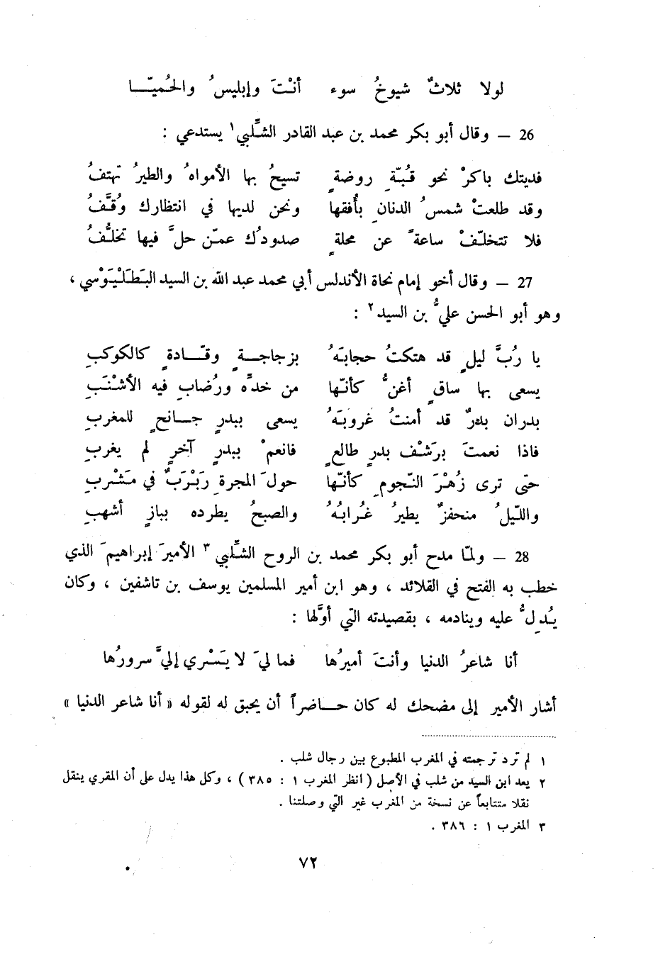 فلا تتخلف ساعةً عن محلة ... صدودك عمن حل فيها تخلف 27 - وقال أخو إمام نحاة الأندلس أبي محمد عبد الله بن السيد البطليوسي، وهو أبو الحسن علي بن السيد (2) :