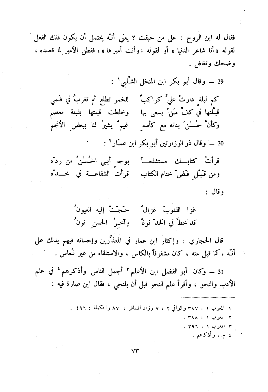 وكأن حسن بنانه مع كأسه ... غيم يشير لنا ببعض الأنجم 30 - وقال ذو الوزارتين أبو بكر ابن عمار (2) :