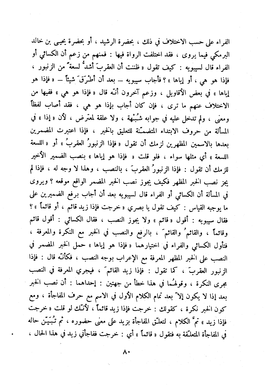 الفراء على حسب الاختلاف في ذلك، بحضرة الرشيد، أو بحضرة يحيى بن خالد البرمكي فيما يروى، فقد اختلفت الرواة فيها: فمنهم من زعم أن الكسائي أو الفراء قال لسيبويه: كيف تقول ظننت أن العقرب أشد لسعةً من الزنبور، فإذا هو هي، ففيها من الاختلاف عنهم ما ترى، فإن كان أجاب بإذا هو هي، فقد أصاب لفظاً ومعنى، ولم تدخل عليه في جوابه شبهة، ولا علقة لمعترض، لأن إذا في المسألة من حروف الابتداء المتضمنة للتعليق بالخبر، فإذا اعتبرت المضمرين بعدها بالاسمين المظهرين لزمك أن تقول فإذا الزنبور العقرب أو اللسعة اللسعة أي مثلها سواء، فلو قلت فإذا هو إياها بنصب الضمير الأخير للزمك أن تقول: فإذا الزنبور العقرب، بالنصب، وهذا لا وجه له، فإذا لم يجز نصب الخبر المضمر الواقع موقعه ويروى في المسألة أن الكسائي أو الفراء قال لسيبويه بعد أن أجاب برفع الضميرين على ما يوجبه القياس: كيف تقول يا بصري خرجت فإذا زيد قائم، أو قائماً فقال سيبويه: أقول قائم ولا يجوز النصب، فقال الكسائي: أقول قائم وقائماً، والقائم والقائم، بالرفع والنصب في الخبر مع النكرة والمعرفة، فتأول الكسائي والفراء في اختيارهما فإذا هو إياها حمل الخبر المضمر في النصب على الخبر المظهر المعرفة مع الإعراب بوجه النصب، فكأنه قال: فإذا الزنبور العقرب، كما: فإذا زيد القائم، فيجري المعرفة في النصب مجرى النكرة، وقولهما في هذا خطأ من جهتين: إحداهما: أن نصب الخبر بعد إذا لا يكون إلا بعد تمام الكلام الأول في الاسم مع حرف المفاجأة، ومع كون الخبر نكرة، كقولك: خرجت فإذا زيد قائماً، لأنك لو قلت خرجت فإذا زيد تم الكلام، لتعلق المفاجأة بزيد على معنى حضوره، ثم تبين حاله في المفاجأة المتعلقة به فتقول قائماً أي: خرجت ففاجأني زيد في هذا الحال
