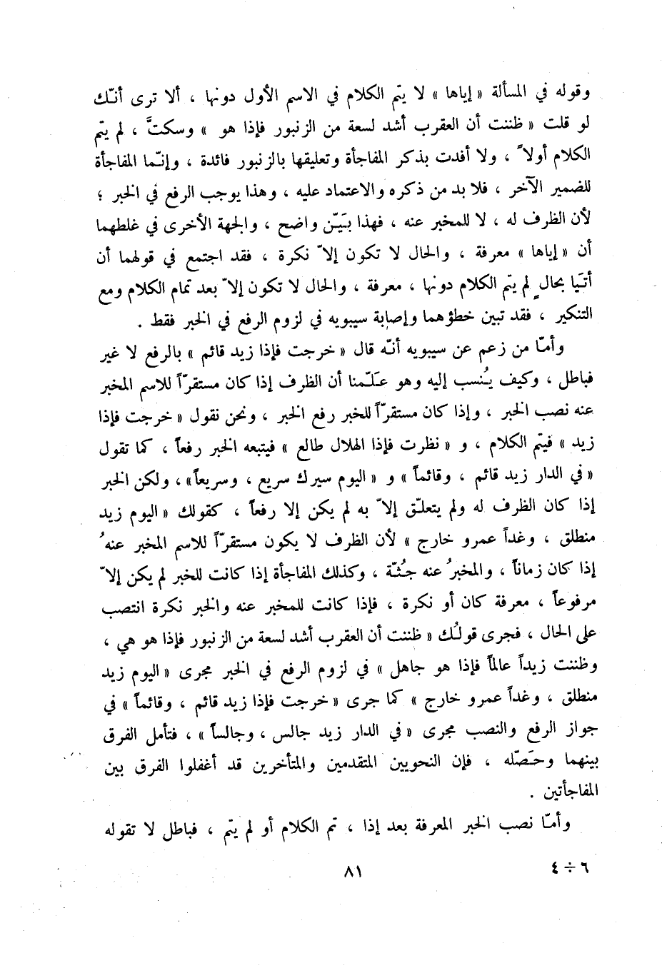 وأما من زعم عن سيبويه أنه قال خرجت فإذا زيد قائم بالرفع لا غير باطل، وكيف ينسب إليه وهو علمنا أن الظرف إذا كان مستقراً للاسم المخبر عنه نصب الخبر، وإذا كان مستقراً للخبر رفع الخبر، ونحن نقول: خرجت فإذا زيد فيتم الكلام، ونظرت فإذا الهلال طالع فيتبعه الخبر رفعاً، كما تقول في الدار زيد قائم، وقائماً واليوم سيرك سريع، وسريعاً، ولكن الخبر إذا كان الظرف له ولم يتعلق إلا به لم يكن إلا رفعاً، كقولك اليوم زيد منطلق، وغداً عمرو خارج لأن الظرف لا يكون مستقراً للاسم المخبر عنه إذا كان زماناً، والمخبر عنه جثة، وكذلك المفاجأة إذا كانت للخبر لم يكن إلا مرفوعاً، معرفة كان أو نكرة، فإذا كانت للمخبر عنه والخبر نكرة انتصب على الحال، فجرى قولك ظننت أن العقرب أشد لسعة من الزنبور فإذا هو هي، وظننت زيداً عالماً فإذا هو جاهل في لزوم الرفع في الخبر مجرى اليوم زيد منطلق، وغداً عمرو خارج كما جرى خرجت فإذا زيد قائم، وقائماً في جواز الرفع والنصب مجرى في الدار زيد جالس وجالساً، فتأمل الفرق بينهما وحصله، فإن النحويين المتقدمين والمتأخرين قد أغفلوا الفرق بين المفاجأتين.