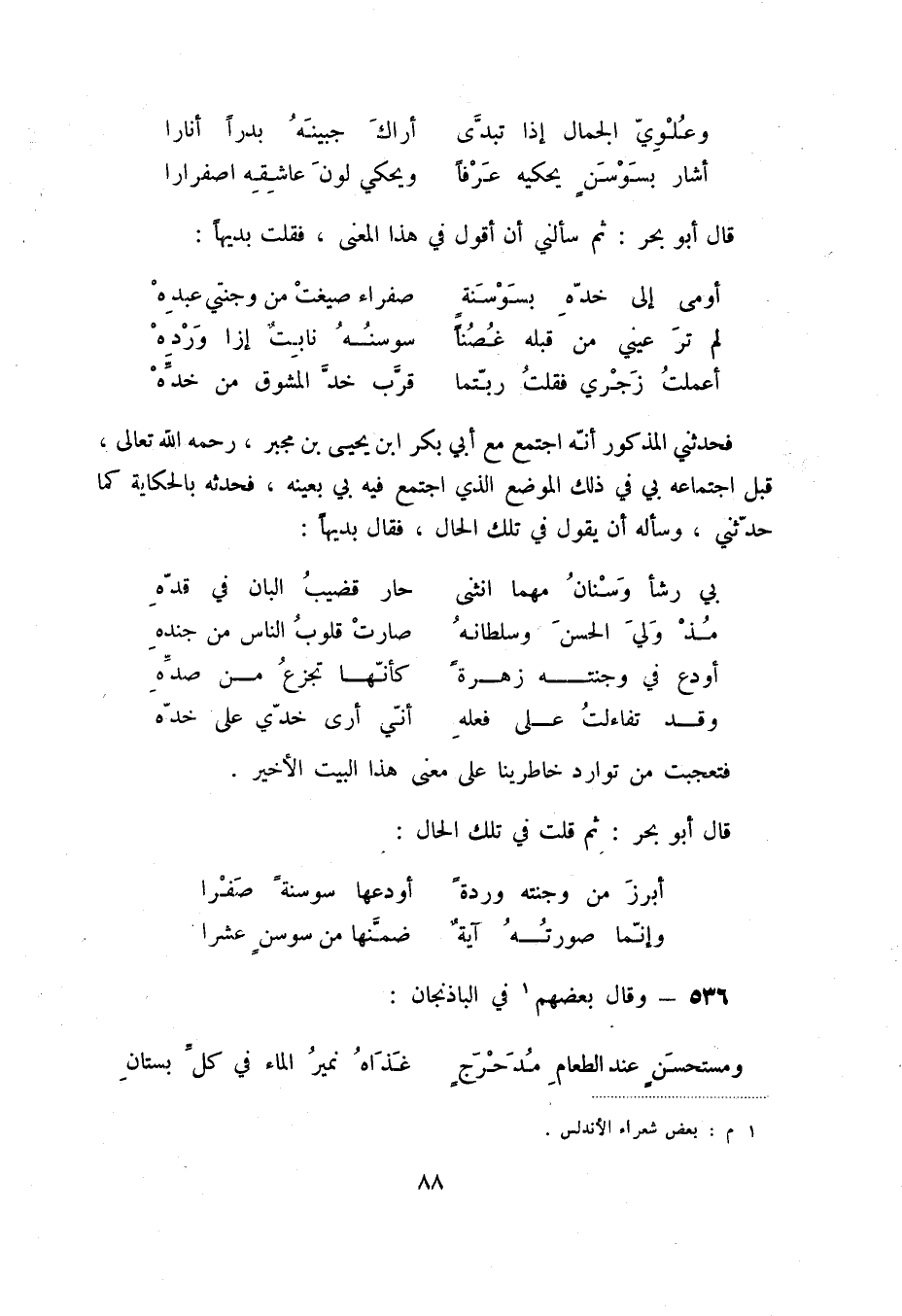 أشار بسوسنٍ يحكيه عرفاً ... ويحكي لون عاشقه اصفرارا قال أبو بحر: ثم سألني أن أقول في هذا المعنى، فقلت بديهاً: