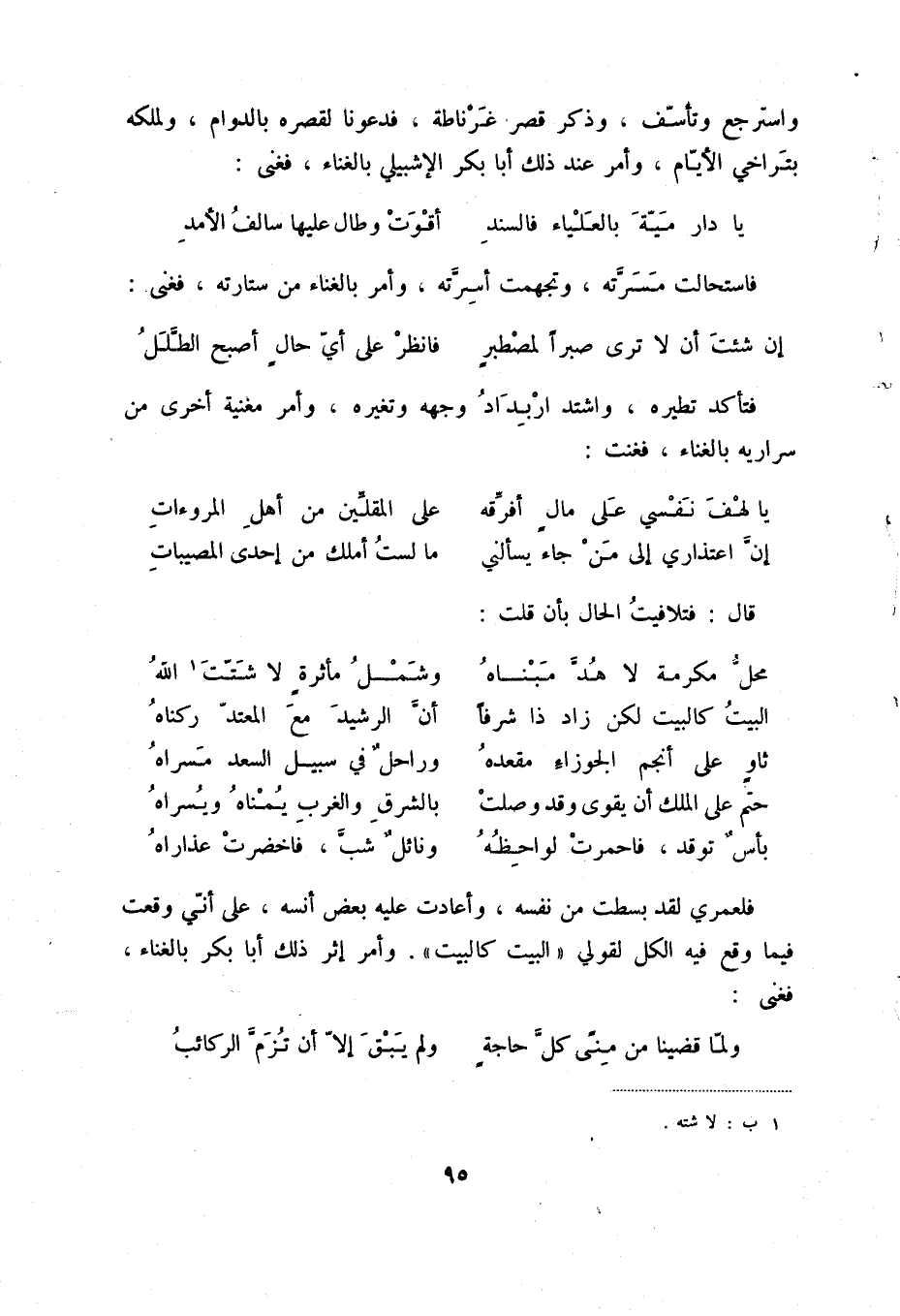 بأسٌ توقد، فاحمرت لواحظه ... ونائلٌ شبَّ، فاخضرت عذراه فلعمري لقد بسطت من نفسه، وأعادت عليه بعض أنسه، على أني وقعت فيما وقع فيه الكل لقولي " البيت كالبيت ". وأمر إثر ذلك أبا بكر بالغناء، فغنى: